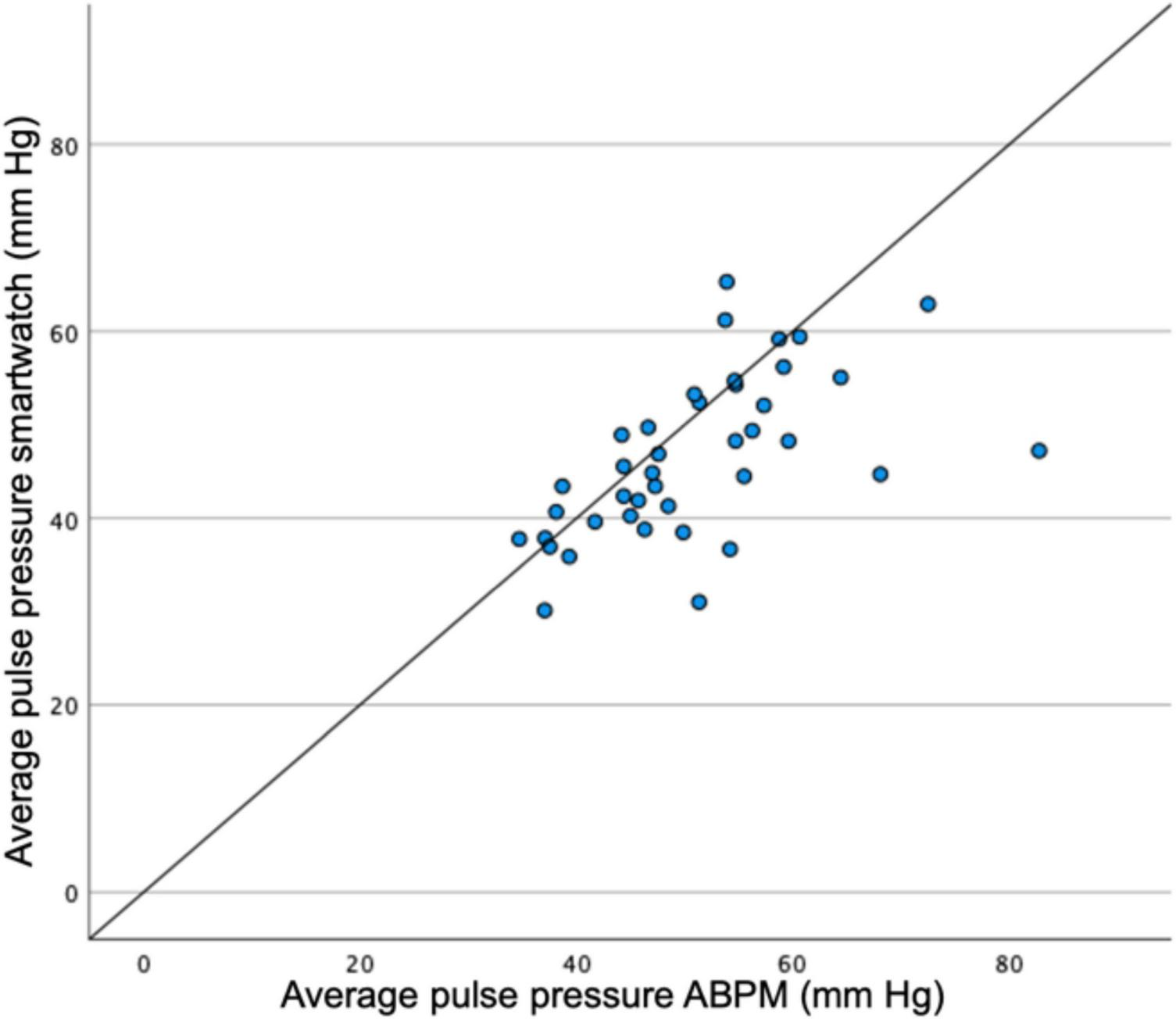 Forty patients were included. Bland-Altman and Taffé methods demonstrated a proportional bias, in which low systolic BPs are overestimated, and high BPs are underestimated. Diastolic BPs were all overestimated, with increasing bias toward lower BPs. Sensitivity and specificity for detecting systolic and/or diastolic hypertension were 83 and 41%, respectively. ROC curves demonstrate an area under the curve (AUC) of 0.78 for systolic hypertension and of 0.93 for diastolic hypertension. BP variability was systematically higher in the ABPM measurements compared to the smartwatch measurements.