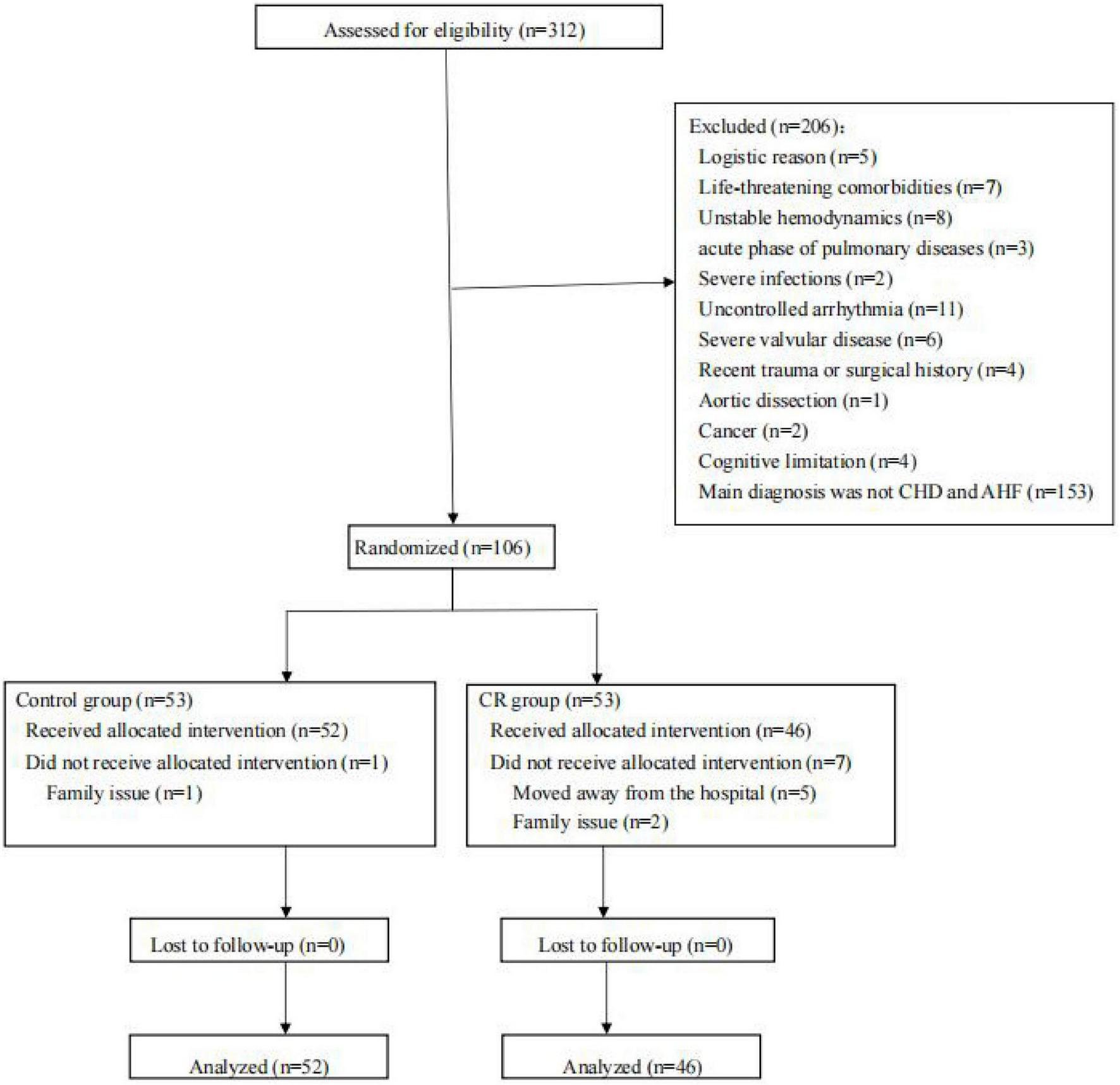 Randomization and allocation sequence was based on a block size fixed to 2 and generated through a computerized random number generator by a staff not involved in the trial. The patients in control group were treated with ordinary standard medical treatment. The patients in CR group received medical treatment plus 1-week phase 1 CR program during hospitalization.