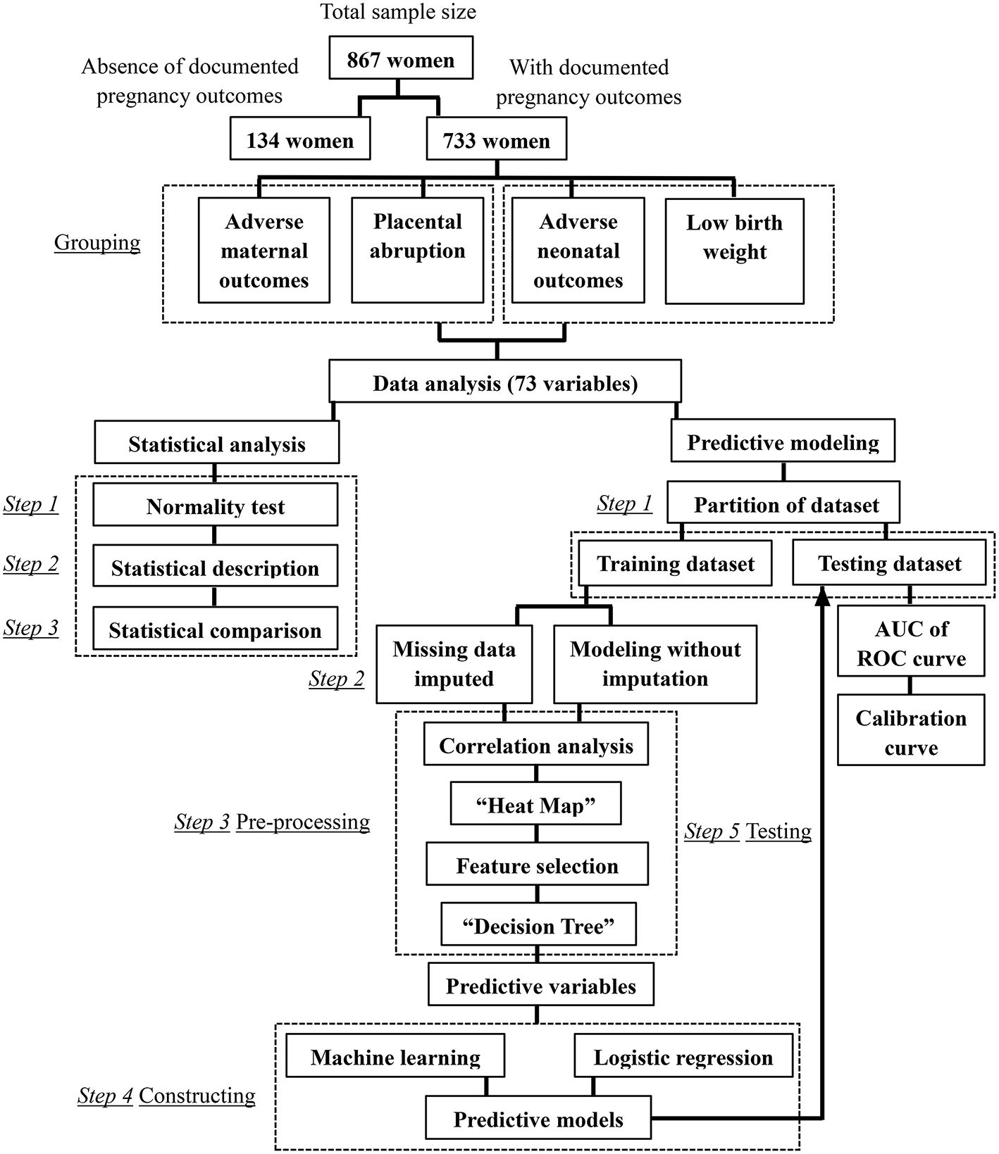 Therefore, the primary objective of this study was to evaluate the performance of ML and LR for the development of short-term predictive models for binary maternal or neonatal outcomes involving pre-eclampsia, and the models were generated by common clinical indicator. The secondary objective was to further explore the characteristics of these models when applied to our structural medical recodes, aiming to provide information for the match-up patterns of the two modeling approaches, which are from two different domains but share similar themes.