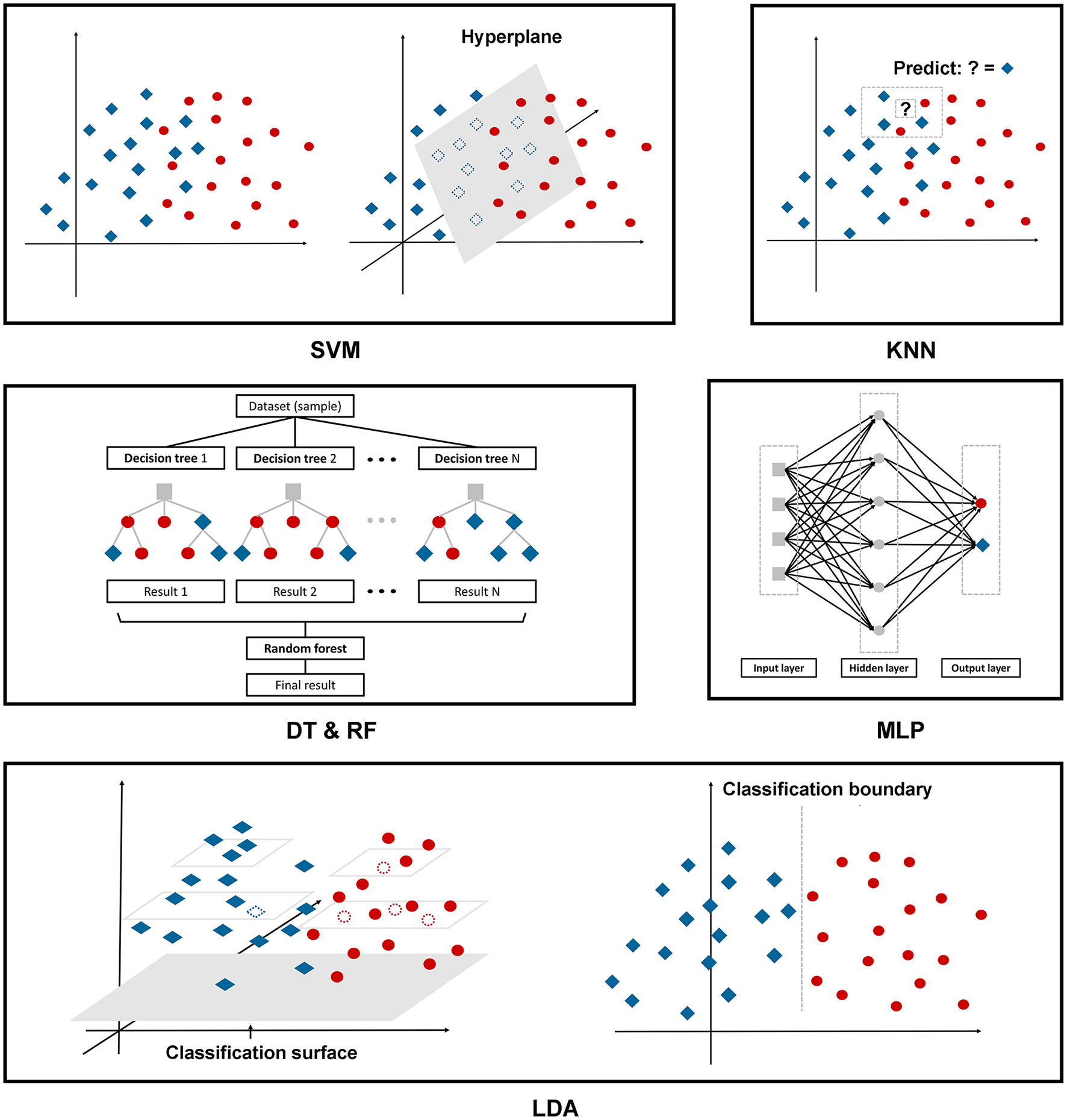 The following are the six ML algorithms we applied to construct the models, and Figure 2 depicts these algorithms in a more illustrative way.
