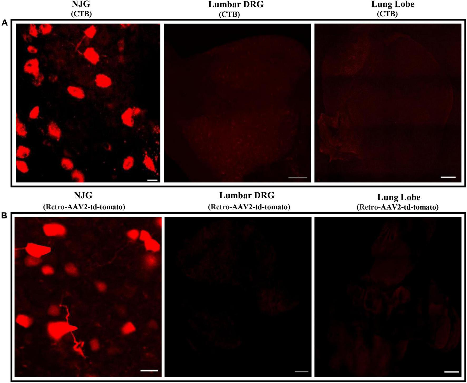 Whole NJG or cryo-sectioned NJG (7 μm slices) and lumbar DRGs were fixed in 4% PFA. NJGs, lumbar DRGs, and, cleared lung tissue were imaged using a confocal laser scanning microscope (Zeiss, LSM 880). Individual slices were analyzed from non-viral tracer (CTB and FB) and viral tracer (retro-AAV2-td-tomato and retro-AAV9-GFP) administrated mice using Z-stack imaging with confocal microscopy. For CTB imaging, excitation wavelength of 633 nm (filter wavelength range of 562–642 nm) and for FB imaging, excitation wavelength of 561 nm (laser DPSS 561-10, GFP filter wavelength range of 410–513 nm) was used. For GFP imaging, laser wavelength of 549 nm (filter 491–606 nm) and for td-tomato imaging, excitation wavelength of 561 (laser HENE633, filter range of 566–697 nm) was used. Images were processed with Zen 2 (Zeiss) software. Labeled neurons were manually quantified for 3 animals that received retrograde viral tracers and 5 animals that received non-viral (CTB/FB) tracers.