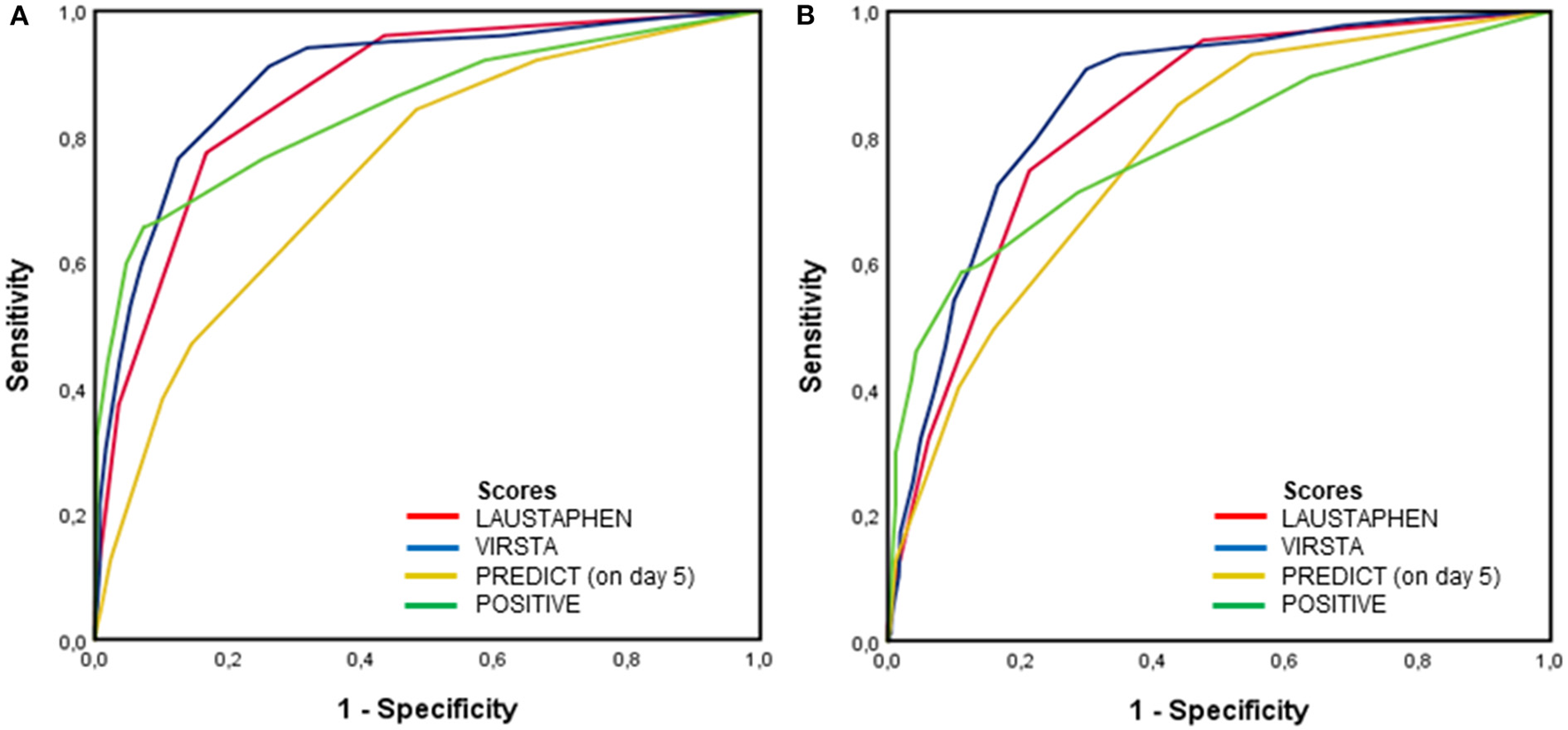 We used the predefined cut-offs of the evaluated scores (VIRSTA, POSITIVE, and day 5 PREDICT) for the identification of patients at low or high risk for IE (8, 10, 19). Episodes with VIRSTA score ≥3 (8), POSITIVE score ≥5 (10), and PREDICT score (on day 5) ≥2 (19) were considered at high risk for IE.
