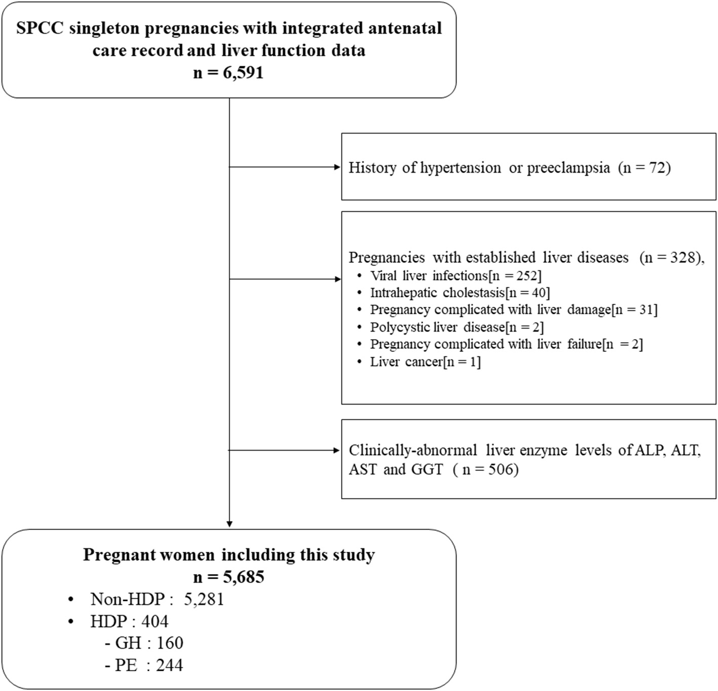 A total of 6,591 participants had complete GH and PE diagnosis record and liver enzyme data, of which 400 participants were excluded because of hypertension and PE history (n = 72), and established liver diseases during this pregnancy (n = 328). Further, 506 participants with clinically-abnormal liver enzyme levels were excluded. Finally, 5,685 pregnant women were included for analysis, among which 160 (2.8%) developed GH and 244 (4.3%) developed PE, respectively (Figure 1).