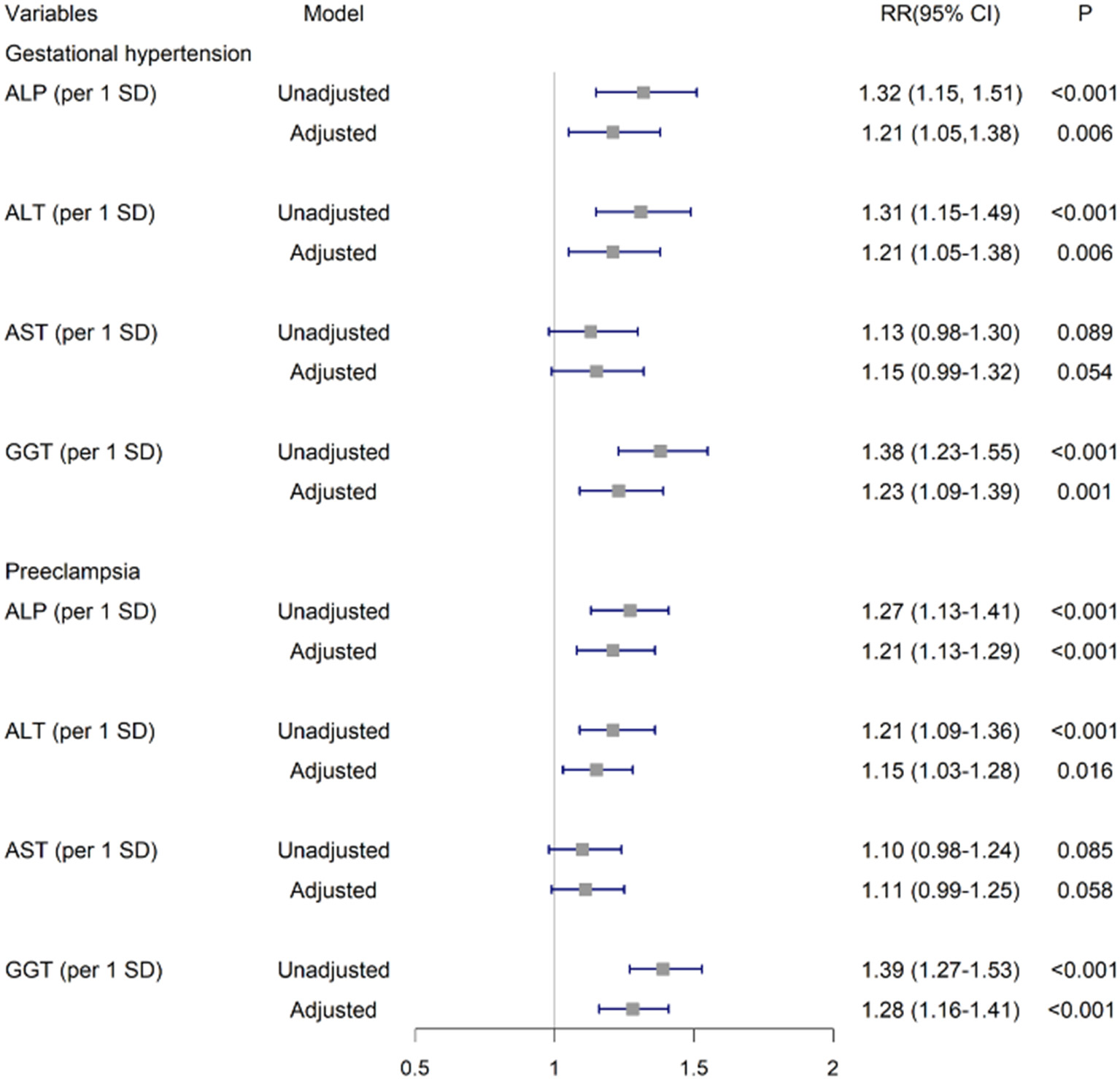 After adjustment for covariates, per SD of ALP, ALT and GGT were positively associated with GH as (aRR, 1.21 [95%CI, 1.05–1.38]; 1.21 [1.05–1.38]; and 1.23 [1.09–1.39], respectively). These significant associations persisted for PE (1.21 [1.13–1.29], 1.15 [1.03–1.28],and 1.28 [1.16–1.41], respectively). No significant associations were found for AST as continuous variables with GH or PE (Figure 2).