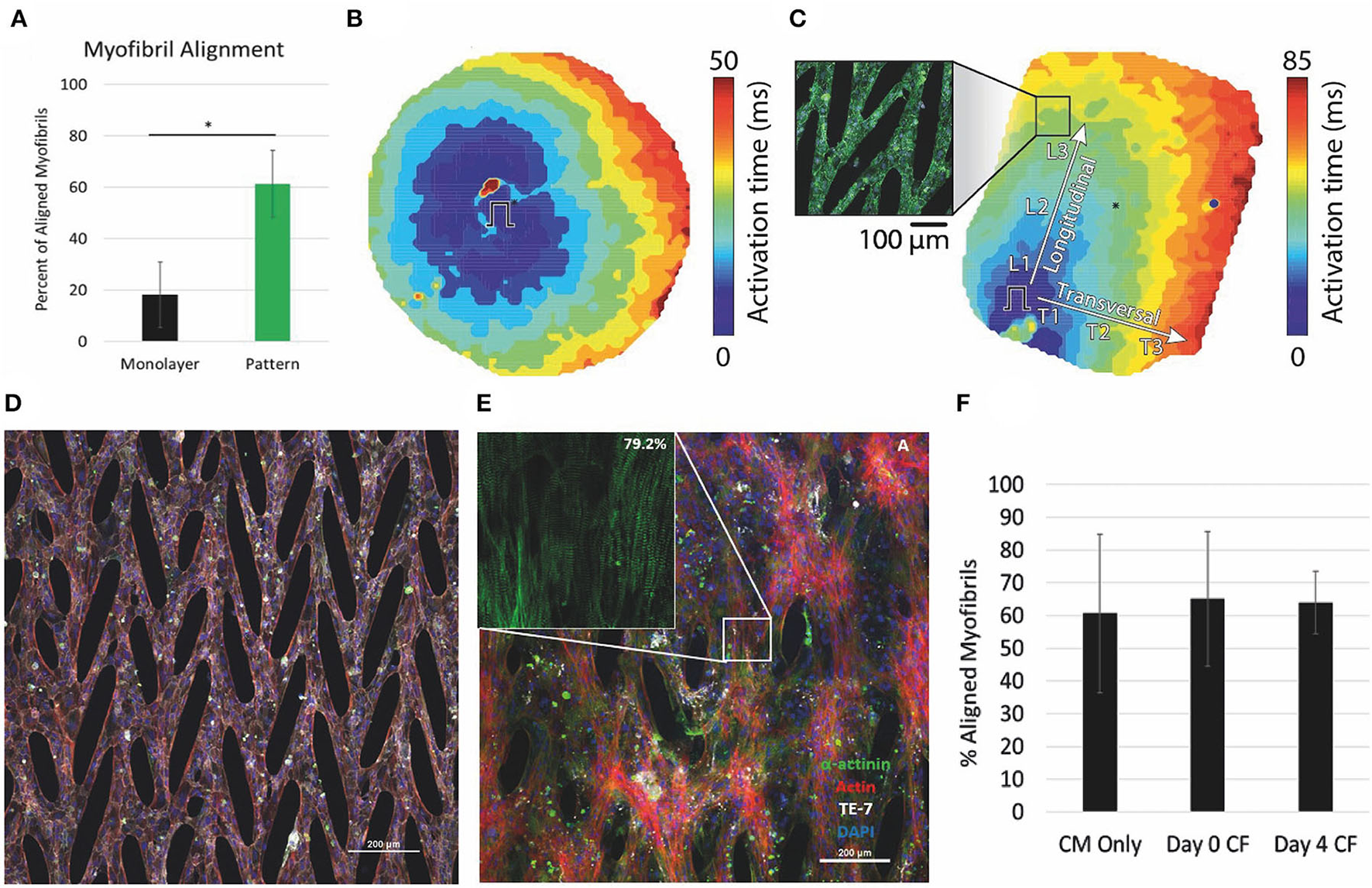 Micropattern culture of iPS-CMs results in anisotropic conduction and improved myofibril alignment, which is maintained in coculture with CFs. (A) Percent of myofibrils aligned within 10 degrees of the primary axis significantly different in monolayers vs micropatterned. (B,C) Optical mapping of (B) monolayer and (C) micropatterned iPS-CMs. Ansiotropic conduction in patterned determined by comparison of the longitudinal (CVL) and transverse (CVT) conduction velocities. (D) iPS-CMs cultured on micropattern alone. Scale bar 200μM. (E) Aligned myofibrils of iPS-CMs seeded on micropatterned substrate maintained in co-culture with CFs at 18 days. Inset shows myofibrils with 79% of sarcomeres within 10 degrees of the superior angle. Scale bar 200μM. (F) Quantification of the percent of myofibrils aligned within 10 degrees of the superior angle at 18 days for the three conditions: iPS-CMs cultured alone, iPS-CMs co-cultured with CFs from Day 0 seeding, iPS-CMs co-cultured with CFs from Day 4 of seeding. (A–C) modified from (97), (D,E) unpublished data, and (F) modified from (99).