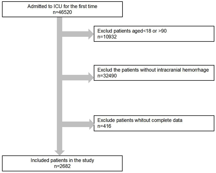 The type of intracranial hemorrhage mainly included “intracerebral,” “extradural,” “subdural,” “unspecified intracranial,” “subarachnoid,” and “multiple.” Head trauma was defined as “yes” or “no”. ICU types included cardiology care unit (CCU), cardiovascular surgery rehabilitation unit (CSRU), insurance intensive care unit (MICU), surgical intensive care unit (SICU) and trauma/surgical intensive care unit (TSICU). Medications mainly included vasopressin, nitrate esters, β receptor blockers, benzodiazepines, statins and potassium. Additionally, data on comorbidities were obtained, including heart failure, hypertension, myocardial infarction, cerebral infarction, diabetes, chronic kidney disease and malignant tumor, according to the ICD-9 codes recorded in the MIMIC-III database.