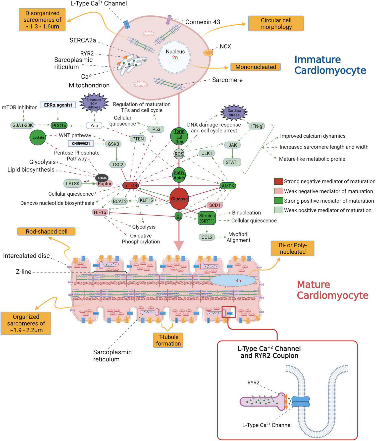 Immature hiPSC-CMs differ from adult CMs over a broad spectrum of parameters that includes but is not limited to underdeveloped mitochondria (both in amount and with cristae structure), limited fatty acid oxidation capacity, lack of T-tubules, disorganized myofibrils, and sarcomeres, and altered transcriptional/post-transcriptional networks that generate electrical/mechanical forces and excitation-contraction coupling. Researchers have used various approaches including electrical/mechanical/chemical stimulation, extended culture duration, heart tissue engineering, various ECM components, non-coding-RNAs, and co-culturing with fibroblasts/human Mesenchymal Stem Cells to induce maturation, but these approaches are only partially effective (10).