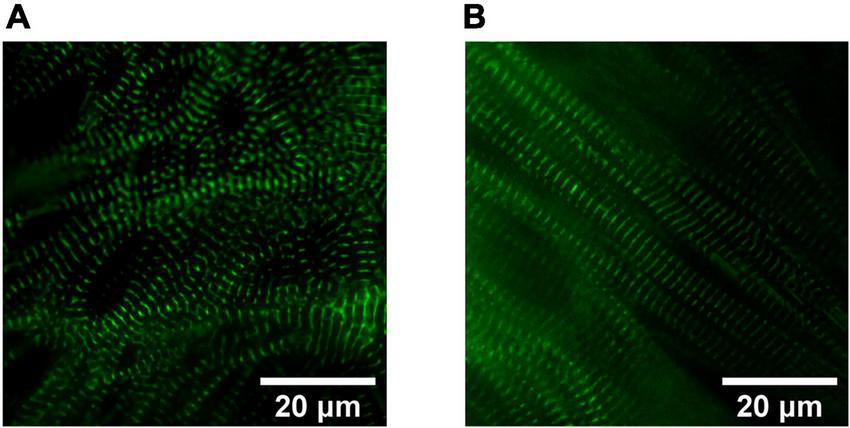 Sarcomere organization in hiPSC-derived cardiomyocytes (CMs). Widefield fluorescence images (Videos of beating CMs available) of 1 Hz paced hiPSC-derived CMs expressing mEGFP-labeled α-actinin-2 at sarcomeric z-disks (cell line ID: AICS-0075 cl.85). (A) Human iPSC-CMs cultured for 40 days in RPMI1640/B27 have less sarcomeric organization compared to (B) Day 40 human induced pluripotent stem cell-derived cardiomyocytes (hiPSC-CMs) treated for 4 weeks in a metabolic maturation media (MM).