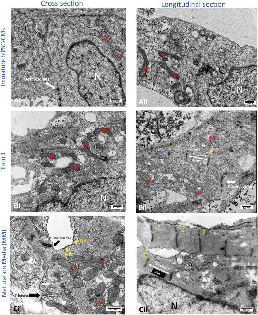 Transmission electron microscopy (TEM) images of the cellular structure of human-induced pluripotent stem cell-derived cardiomyocytes (hiPSC-CMs) after 14 days of 200 nM Torin1 (mTORC1/C2 inhibitor) exposure (B) or 4–5 weeks of metabolic maturation media (MM) (C). In comparison to untreated hiPSC-CMs (A), cells treated with Torin 1 and MM media show dramatically enhanced ultrastructure. In cells treated with Torin 1, prominent Z-lines with aligned and elongated sarcomeres (∼1.3 μm) are observed (Bii). In addition to desmosomes, golgi, and endoplasmic reticulum, the formation of interspersed mitochondria is also observed (Bi). In cells incubated with MM media for four to five weeks, packed mitochondria with well-formed cristae, more significant junctional SR, with possible T-tubule formation are also observed (Ci). In addition to dense peri-nuclear mitochondria, surface dyads with RyR2 on junctional SR were observed (Ci). JSR, junctional SR. M, mitochondrion. N, nucleus. RyR2, type II ryanodine receptor. Z, Z line. i, cross sections of the hiPSC-CM. ii, longitudinal section of the hiPSC-CM.