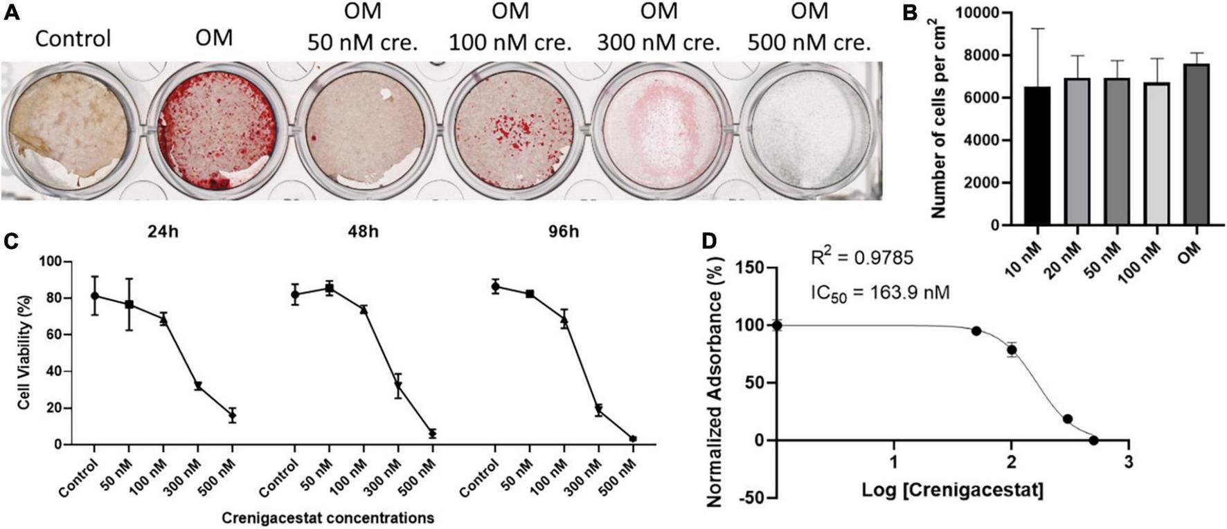To analyze crenigacestat cytotoxicity, cells were treated with different crenigacestat dosages under cultivation in OM at the 24, 48, and 96 h after treatment and then we quantified cell numbers and performed MTT-test. We found that cell count was not significantly differ between control and concentrations bellow 100 nM (Figure 2B) and we see low cytotoxicity in these concentrations (Figures 2C,D). Concentrations higher than 100 nM have cytotoxic effect (Figure 2C) and IC50 for MTT test on 96 h for crenigacestat is 163.9 nM (Figure 2D).