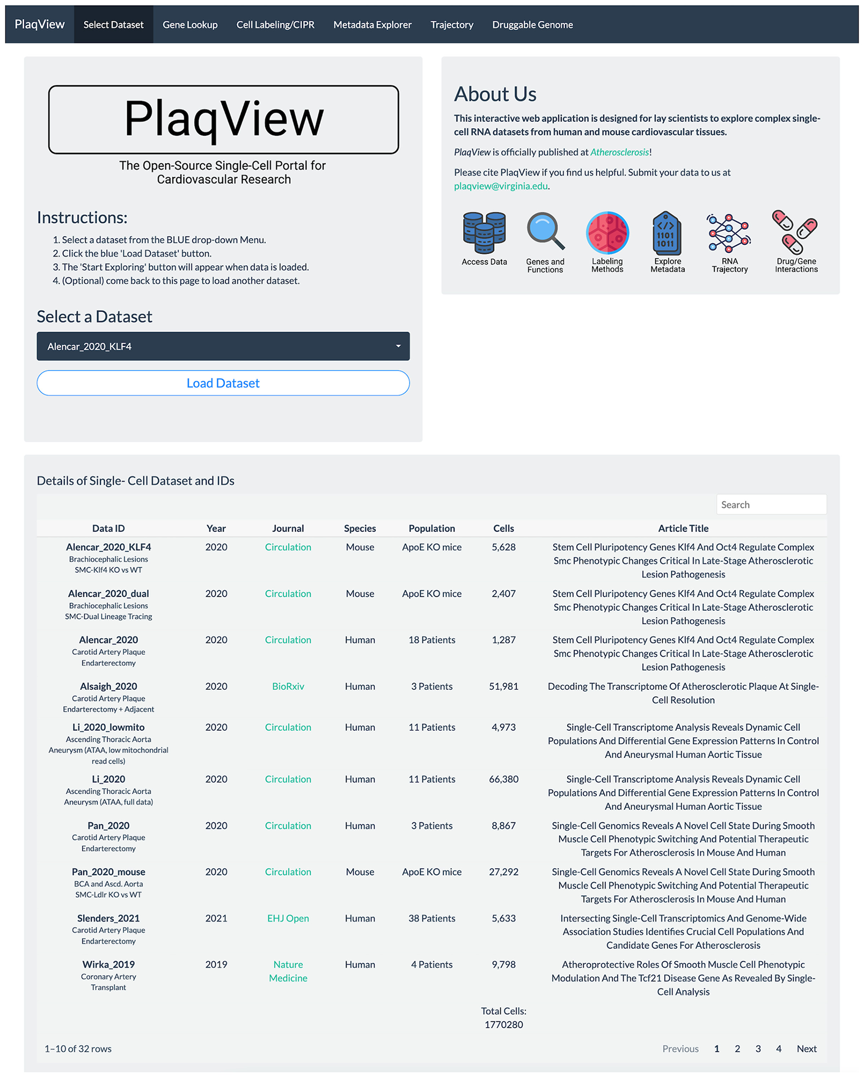 PlaqView 2.0 homepage facilitates selection and loading of relevant datasets. The homepage allows users to browse dataset details and load selected datasets into their dedicated session for further exploration.