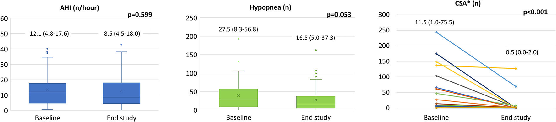 Nocturnal cardiorespiratory monitoring was not performed in 15 patients due to technical reasons. In the remaining 56 patients, despite no significant changes in AHI, CSA and hypopnea events reduced from 0 [0–4] to 0 [0–1] (p = 0.027), and from 27.50 [8.25–56.75] to 16.50 [5.00–37.25] (p = 0.053), respectively (Figure 2). We did not observe significant changes in oxygen desaturation index after treatment with Sacubitril/Valsartan (89.5 ± 2.8 vs. 89.7 ± 2.0 %; p = 0.550). At least one CSA episode was present in 22 patients (39%) at baseline with an average of 11.5 [1.0–75.5] events. After Sacubitril/Valsartan treatment, CSA disappeared in 11 cases (50%) and reduced to 0.5 [0.0–2.0] (p < 0.001) (Figure 2). None of the patients without baseline CSA developed CSA at the follow-up. A further analysis was conducted in patients with AHI >15 (n = 20; 36%), showing similar results (AHI from 23.4 at baseline to 18.2 at the end of the study; p = 0.073; CSA from 7.5 at baseline to 0 at the end of the study; p = 0.003).