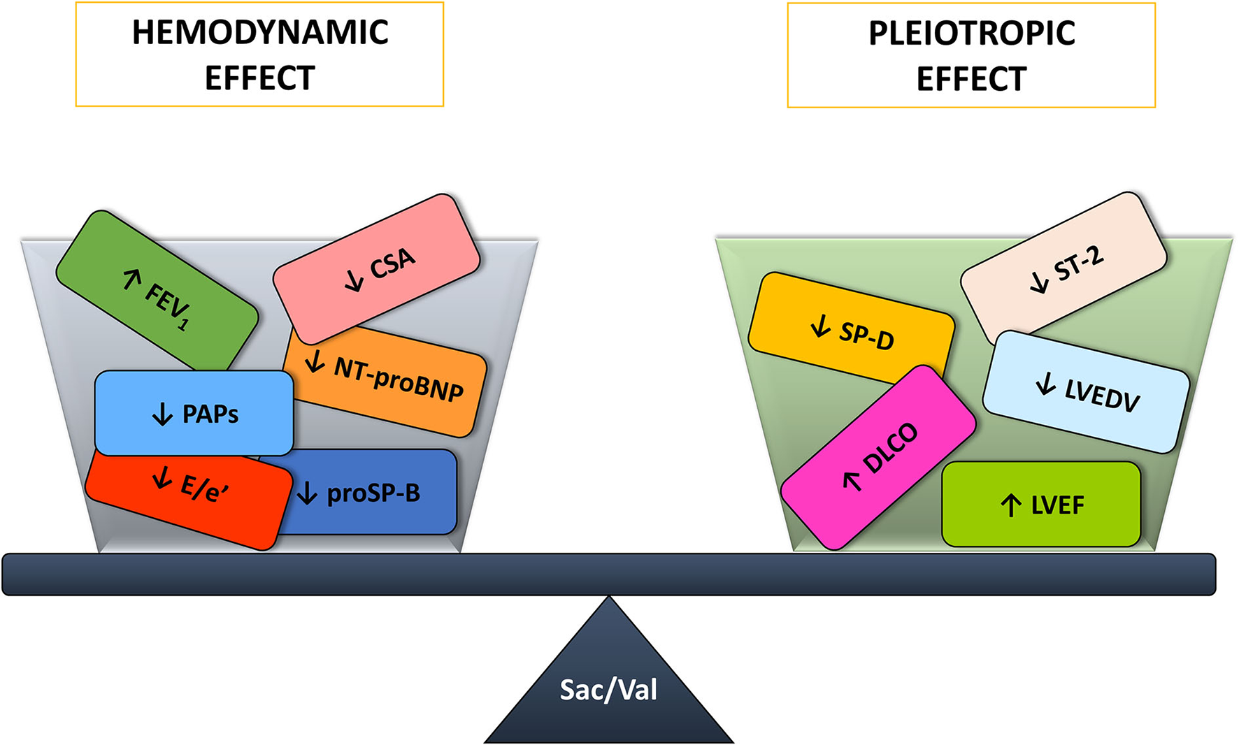 Sacubitril/Valsartan effects share a double pathway: hemodynamic and systemic. The first is evidenced by NT-proBNP, proSP-B, lung mechanics, and CSA improvement. The latter is confirmed by an amelioration of DLCO, ST-2, SP-D as well as by reverse remodeling echocardiographic parameters.