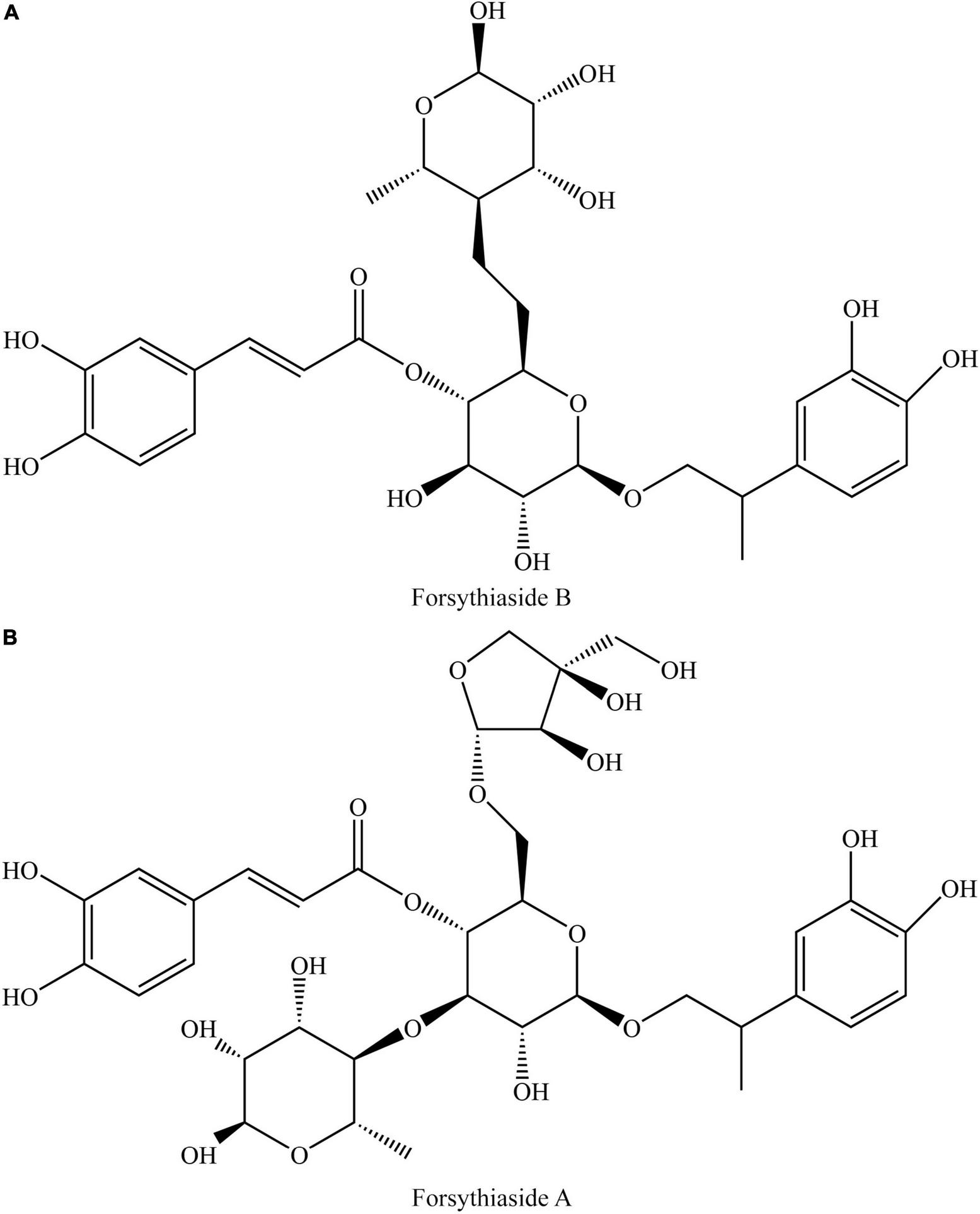 As the important ingredients for Forsythiae Fructus to exert various pharmacological activities, forsythiasides A-K have been isolated from F. suspensa (4–6). Forsythiasides is a kind of glycosides formed by phenylethanol and sugar and have the stem nucleus as shown in Table 1. The glucose can connect with aglycone, rhamnose, xylose, apinose, and caffeoyl. The structures of forsythiasides A-K are displayed in Table 1, and the structures of forsythoside A and B are shown in Figure 1.