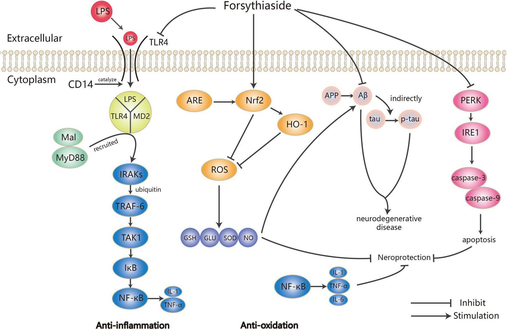 Inflammation is a defense mechanism that occurs when tissues are stimulated by some damages such as trauma, infection by pathogens including bacteria, viruses, parasites, and other inflammatory agents. Inflammatory mediators released from activated mast cells, neutrophils, and macrophages serve as modulator to promote or inhibit the inflammation process (15–17). TLR4/NF-κB is a vital anti-inflammatory pathway, which has attracted much attention in numerous studies on the anti-inflammatory activity of forsythiasides.