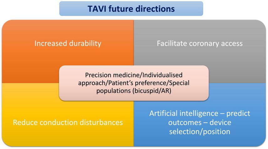 Twenty years after the first breakthrough procedure, TAVI underwent a transformative evolution and currently can be unanimously considered the most striking development in the field of interventional cardiology for the twenty-first century. A lifesaving procedure that was initially developed to treat inoperable and terminal patients with critical AS has now established itself as the treatment of choice for most patients with severe symptomatic AS. As the number of patients that will have an indication for TAVI is likely to further grow with broader expansion and timing for intervention in currently ambiguous scenarios, including moderate AS with heart failure (TAVR UNLOAD trial, NCT02661451), asymptomatic severe AS (EARLY TAVR study, NCT03042104), bicuspid AS and native aortic regurgitation further refinements in the technology behind the THVs and implanting techniques will be necessary to completely eliminate adverse events such as the need for PPM implantation and further improve other aspects such as THV durability and post-TAVI coronary access (Figure 4).