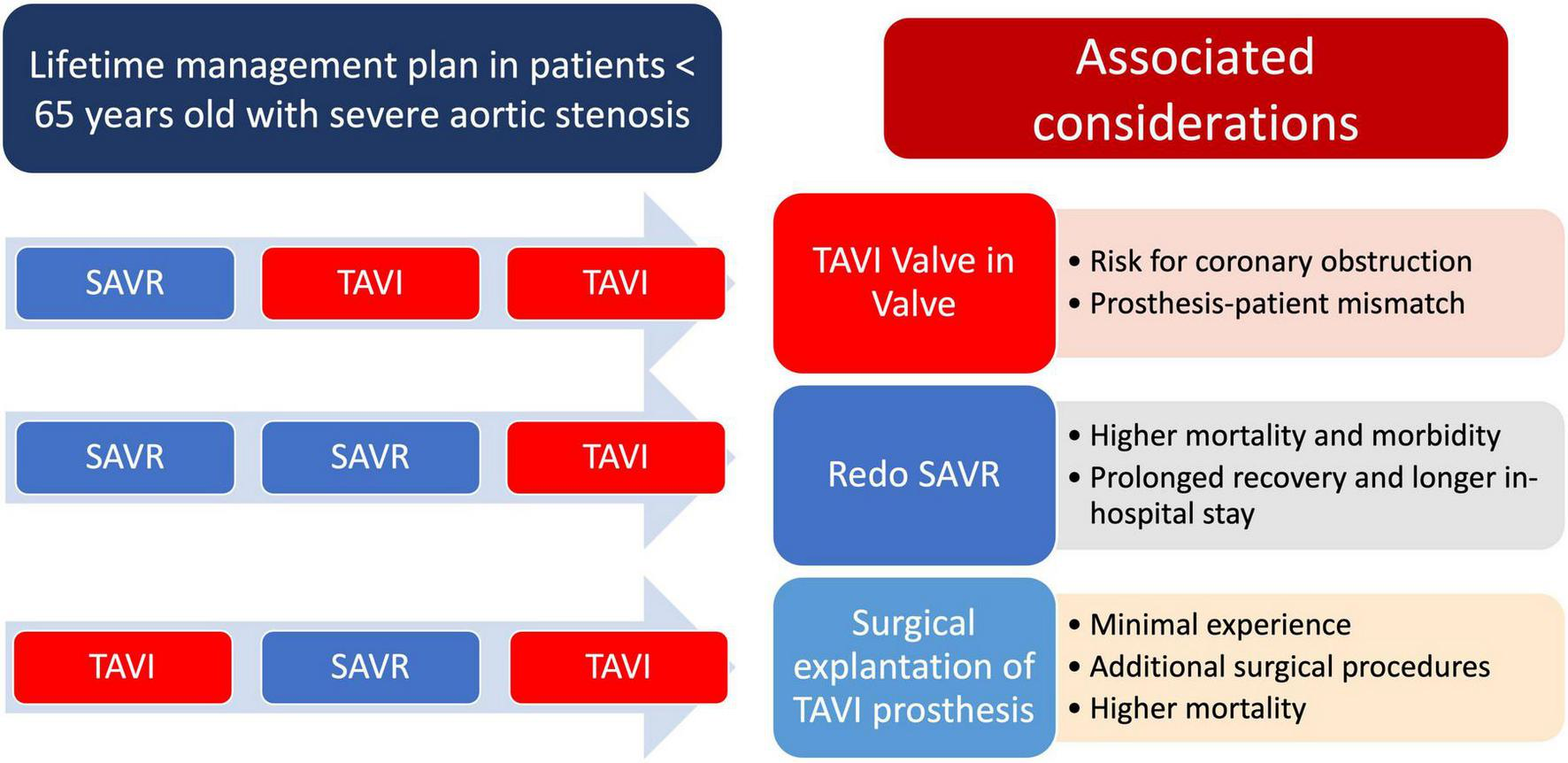 Given the absence of robust data regarding the long-term durability of either surgical or transcatheter BHVs, it is mandatory that in younger patients with life expectancy > 15–20 years, a careful life management plan should be incorporated as the likelihood of these patients undergoing two or more interventions is high (Figure 5). It is desirable that the number of surgical open-heart interventions should be minimized considering the tending preference of most patients for less invasive procedures and the higher operative mortality and morbidity of redo SAVR compared to SAVR in a native valve (41). In this line, incorporating TAVI in the sequence of long-term interventions makes this strategy more realistic and attractive. Redo SAVR and valve-in-valve (ViV) TAVI are both feasible options. If redoing SAVR is expected in patients in their 60s, a potential SAVR-SAVR-TAVI strategy with the TAVI taking place in 70s–80s is a reasonable approach. On the other hand, a less invasive approach with a single open-heart surgery as the initial strategy followed by ViV TAVI (SAVR-TAVI-TAVI) or TAVI-SAVR-TAVI as an alternative single surgery sequence are potential alternative scenarios with the need for only one open-heart surgery during a lifetime, which makes these options intuitively more attractive to the patients. However, in both these strategies, several issues should be considered and discussed with the patient before implementing a lifetime management plan. In the case of SAVR after TAVI, depending on the type of BHV implant at the index TAVI, surgical explantation of the valve may require additional procedural steps and more extensive surgery, such as root replacement and/or replacement of the ascending aorta. The largest so far observational analysis with 5,756 patients with previous TAVI, the incidence of redo SAVR after TAVI was 0.5% with the most frequent indication being infectious endocarditis (67.8% of patients). For most patients, 60.7% required additional cardiac surgical procedures and the overall 12-month mortality was 33.5% (42). On the other hand, ViV TAVI is associated with several considerations, including the risk of coronary obstruction, prosthesis-patient mismatch, and the need for previous surgical bioprosthesis cracking. However, according to a recent large-scale meta-analysis and observational study, ViV TAVI was associated with lower 1-month mortality, a noteworthy threefold reduction in bleeding and respiratory complications, and less in-hospital stay with faster recovery compared to redo SAVR (43, 44). Novel technologies that will further improve the durability of BHVs will facilitate lifetime management plans for younger patients with severe AS. As such the recently presented RESILIA bioprosthetic leaflet tissue (Edwards Lifesciences), which has already been applied in surgical bioprostheses (INSPIRIS RESILIA aortic valve bioprosthesis, Edwards Lifesciences) and now has also been introduced in the new generation Sapien TAVI bioprosthesis has demonstrated excellent 5-year outcomes with no evidence of SVD after SAVR (45).