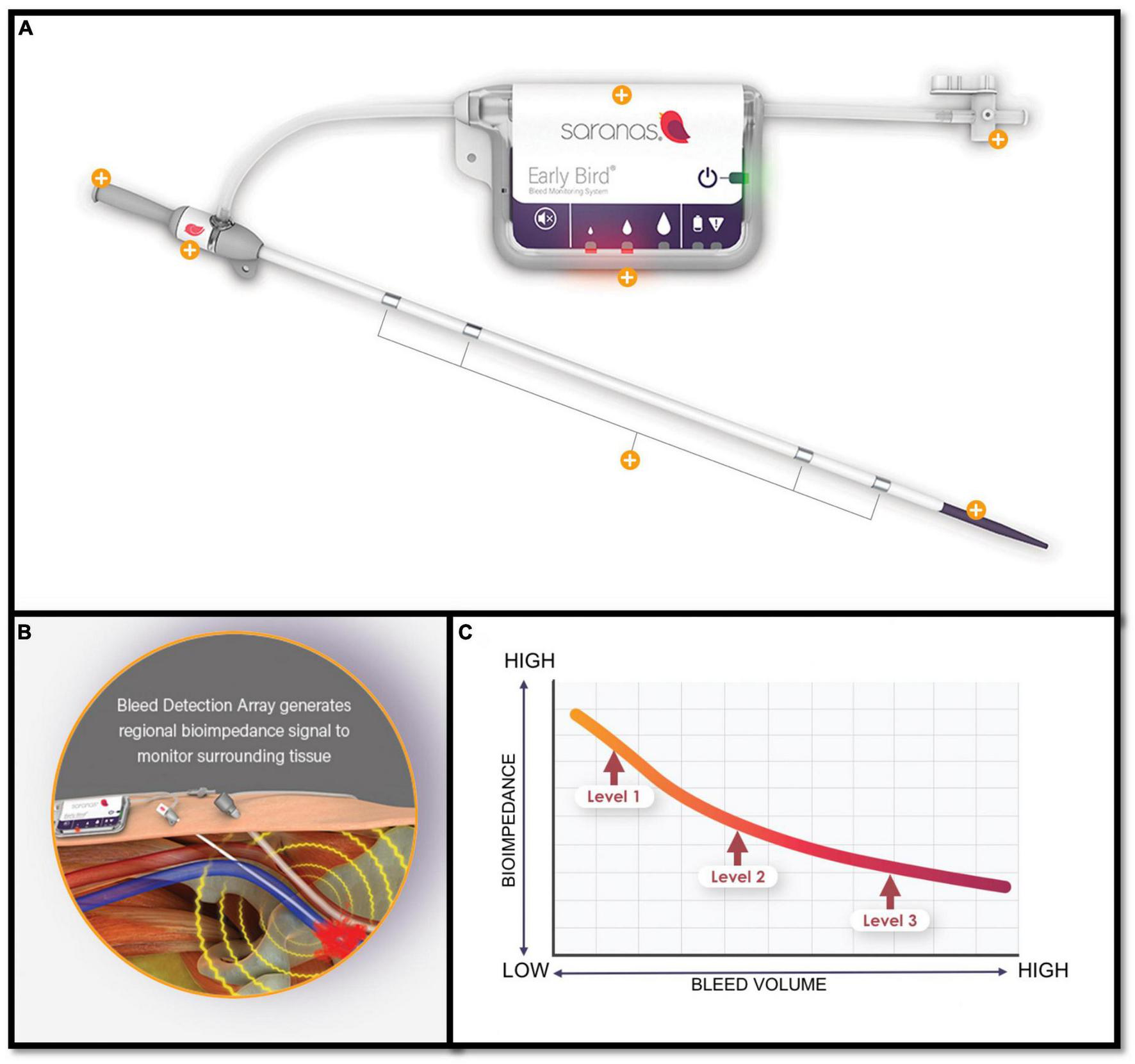 (A) The Saranas Early Bird Bleed Monitoring System. (B) By monitoring nearby tissue bioimpedance can offer early bleeding detection. (C) The lower the bioimpedance the higher the bleeding volume.