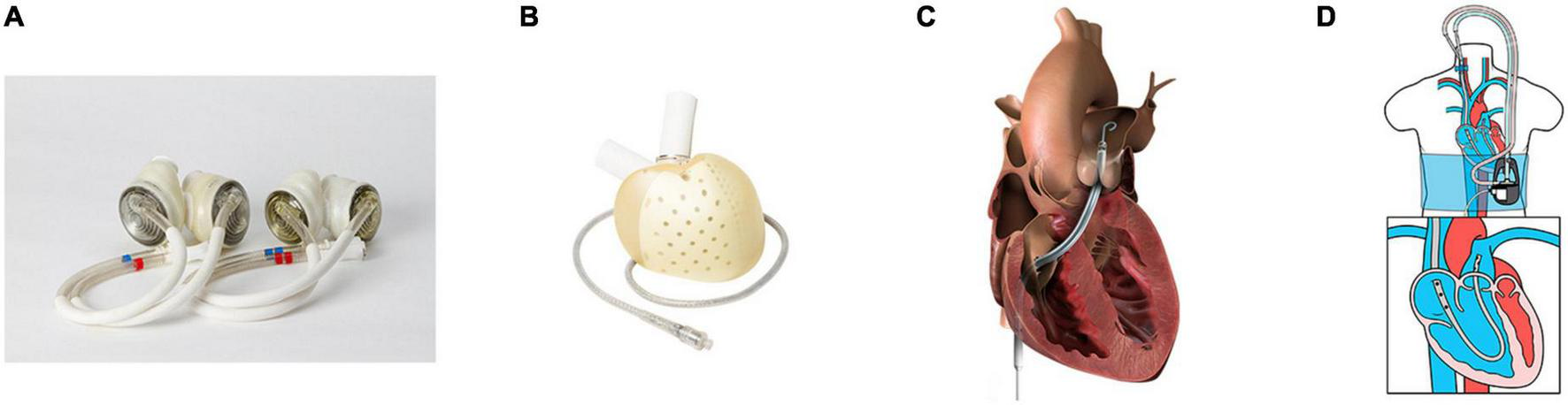 Mechanical circulatory support (MCS) devices for right ventricular/biventricular failure. (A) SynCardia® total artificial heart 70 cc (left) and 50 cc (right), re-use from Villa et al. (60), (B) Aeson® total artificial heart (Image from Carmat SA, used with permission), (C) Impella RP® (Image from Impella RP instruction manual, used with permission), and (D) LifeSparc® pump with ProtekDuo® cannula (Image from Livanova Investor Day 2021 presentation, used with permission).