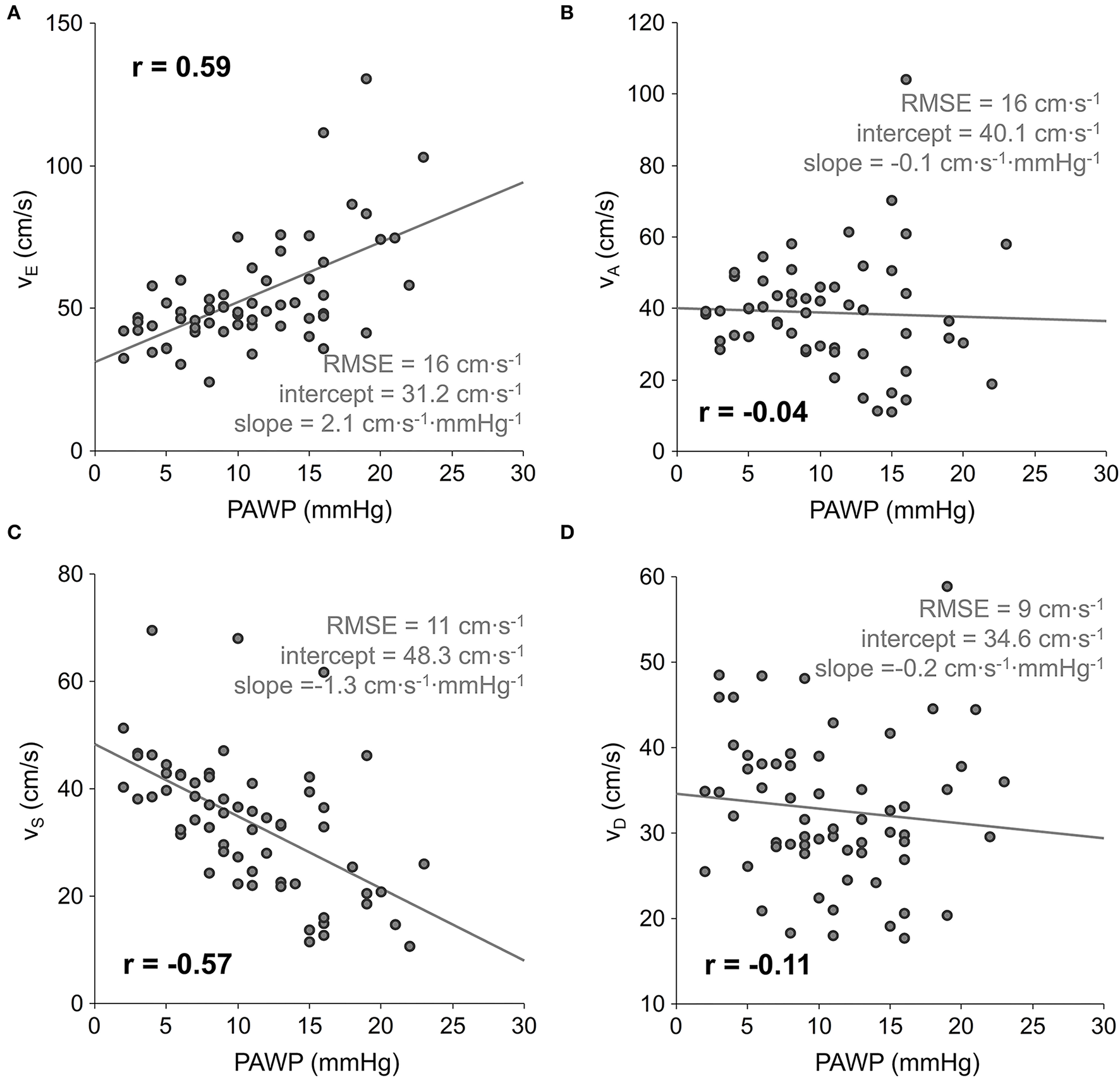 Scatter plots and linear regressions of early diastolic LA peak outflow vE(A), late diastolic LA peak outflow vD(B), systolic LA peak inflow vS(C), and early diastolic LA peak inflow vD(D) velocity on PAWP. PAWP, mean pulmonary artery wedge pressure; r, correlation coefficient; RMSE, root-mean-square error.