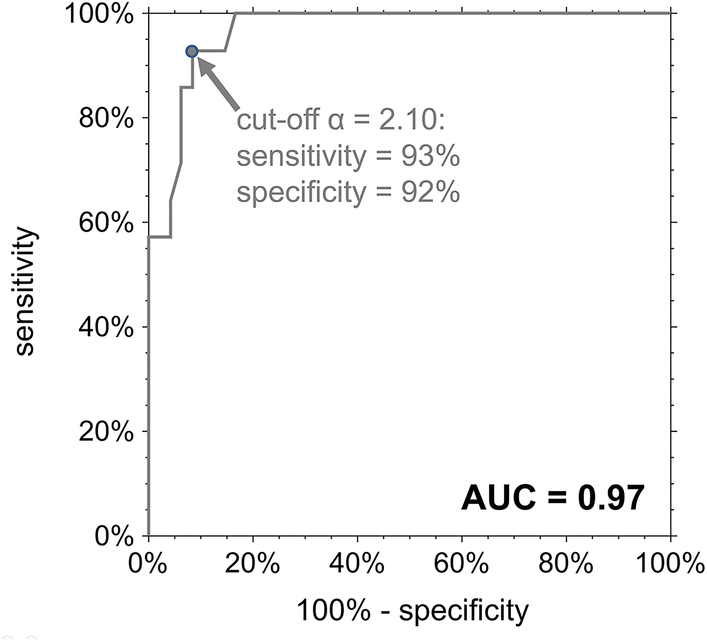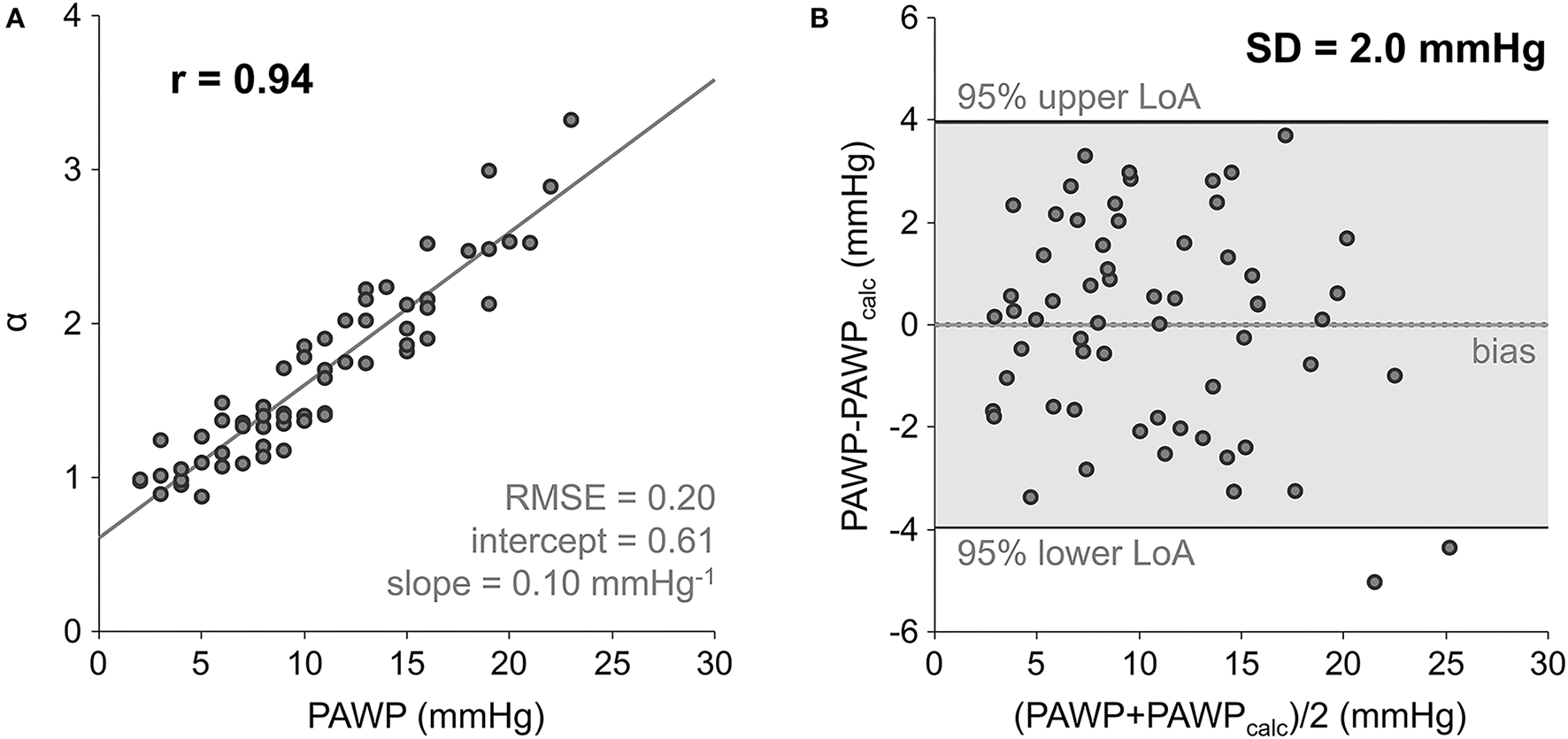 The linear regression equation of α on PAWP was inverted to derive calculated mean pulmonary arterial wedge pressure values PAWPcalc from α and to compare PAWPcalc and PAWP by Bland-Altman analysis. The diagnostic performance of α in predicting PAWP > 15 mmHg was investigated by means of receiver operating characteristic curve (ROC) analysis.