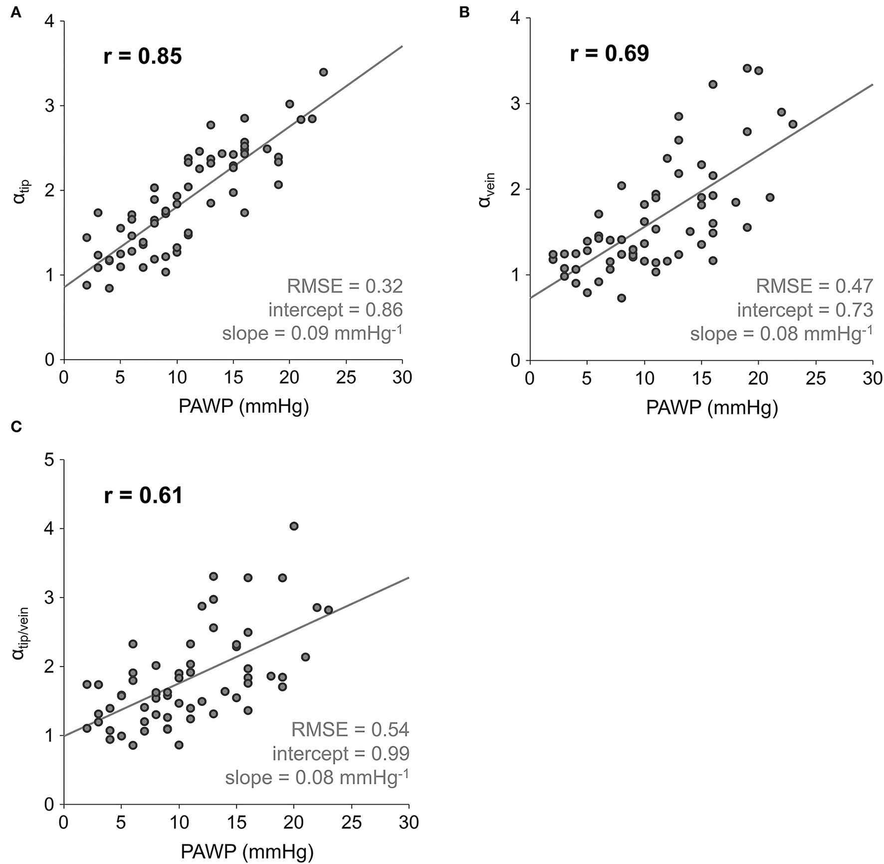 α correlated very strongly with PAWP (r = 0.94). Standard deviation of differences between RHC-derived PAWP and PAWP estimated from linear regression model (α = 0.61 + 0.10·PAWP) was 2.0 mmHg. Employing the linear-regression-derived cut-off α = 2.10, the α-based diagnosis of elevated PAWP revealed the area under the curve 0.97 with sensitivity/specificity 93%/92%.