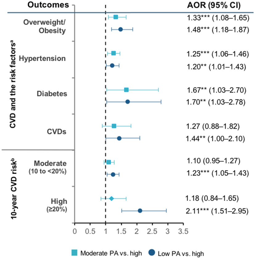 To assess the association between low physical activity, cardiovascular disease (CVD) and risk factors, health service utilization, risk of catastrophic health expenditure, and work productivity in Indonesia.