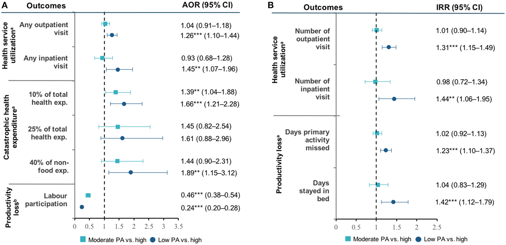 The prevalence of low physical activity increased from 18.2% in 2007 to 39.6% in 2014. Compared with those with high physical activity, respondents with low physical activity were more likely to have a 10-year high CVD risk (AOR: 2.11, 95% CI: 1.51–2.95), use outpatient care (AOR: 1.26, 95% CI: 1.07–1.96) and inpatient care (AOR 1.45, 95% CI: 1.07–1.96), experience catastrophic health expenditure of 10% of total household expenditure (AOR: 1.66, 95% CI: 1.21–2.28), and have lower labor participation (AOR: 0.24, 95% 0.20–0.28).