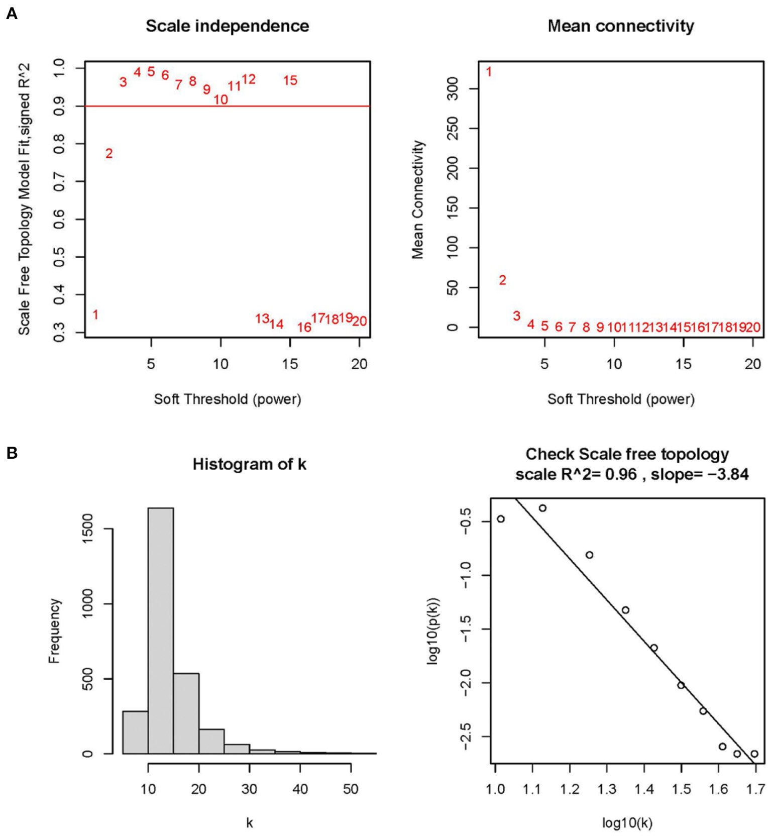 Determining optimal soft thresholds (β) in WGCNA. (A) Examination of the average connectivity under various β and scale-free fitting index. The red line implies that the corresponding soft threshold is 10 when the correlation coefficient is 0.9. (B) Connectivity distribution histogram and a scale-free network correlation coefficient of 0.96 checked at β = 3.