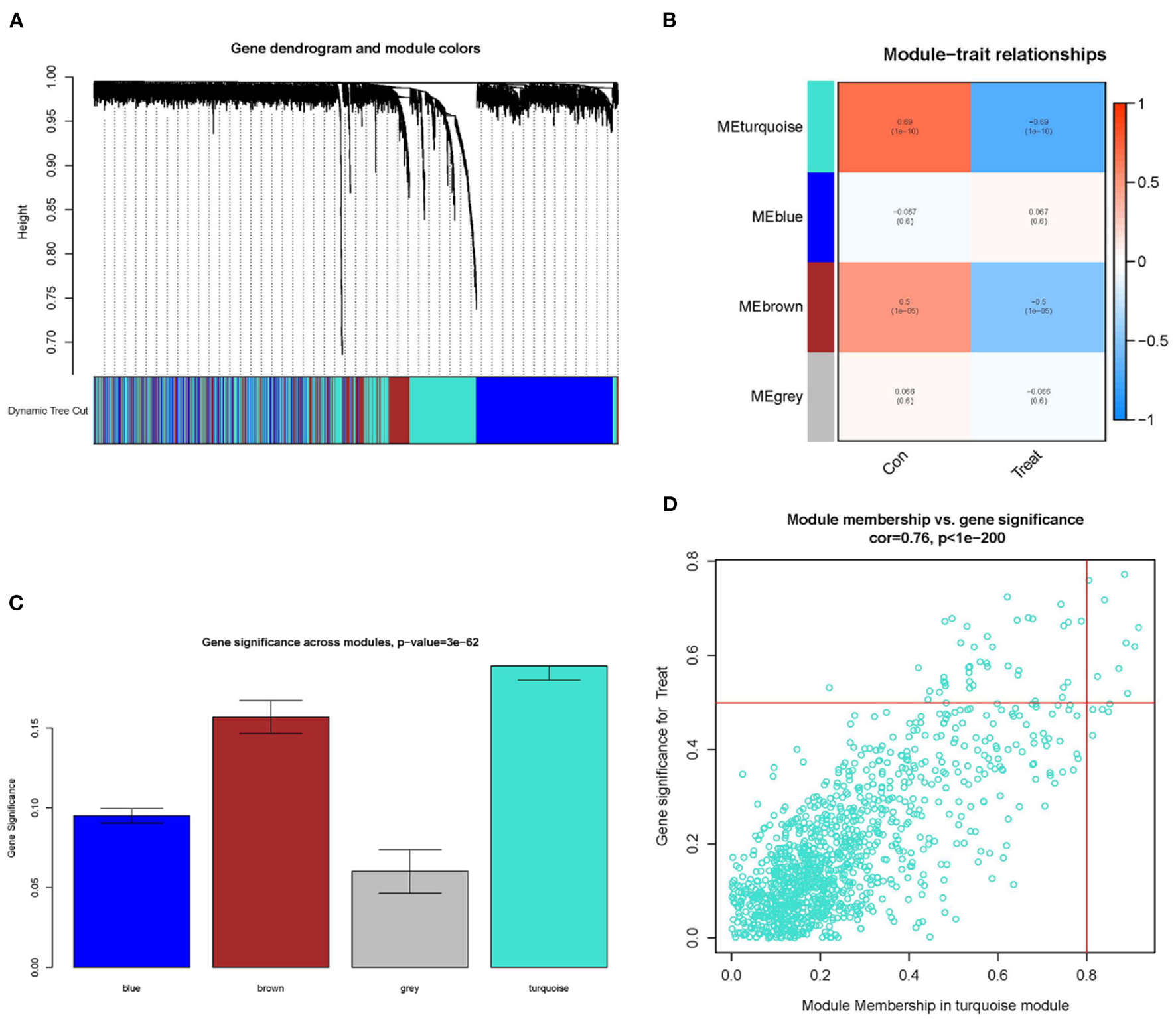 Constructing WGCNA modules and screening candidate key genes. (A) Gene clustering dendrogram: each branch represents a gene, and each color below represents a co-expression module. (B) Module-trait relationships heatmap, with turquoise modules significantly associated with controls. (C) Distributing gene significance in each module. (D) In the turquoise module, a scatter plot of gene module members vs. gene significance is shown, GS > 0.5 and MM > 0.8 are candidate key genes.