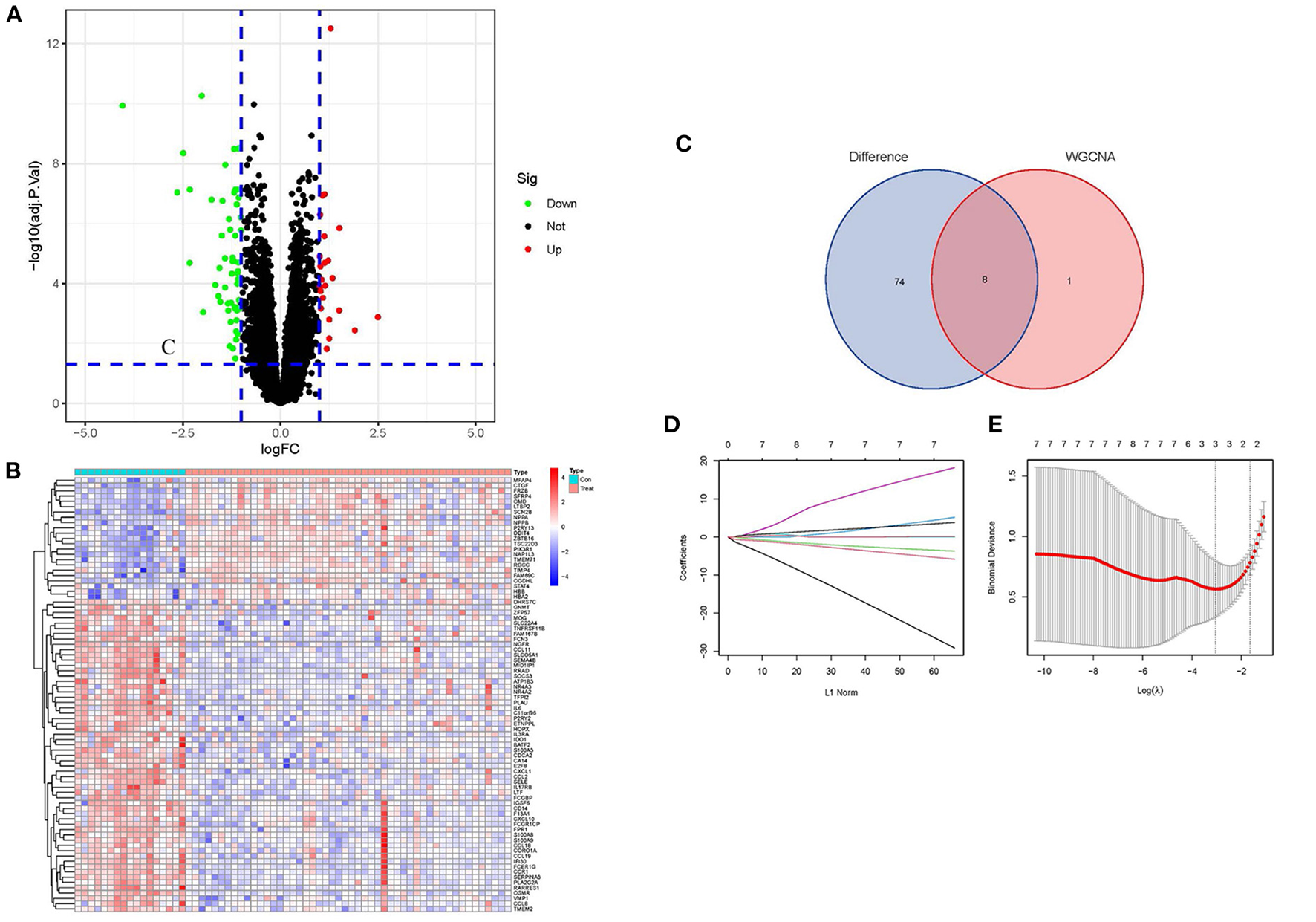 Screening of DEGs and identification of Hub genes. (A) Volcano plots of DEGs expression in control and cardiomyopathy groups. (B) Heatmap of DEGs expression in cardiomyopathy and control groups. (C) Venn diagram of the DEGs' intersection and candidate genes of the turquoise module. (D) Map of the regression coefficients of the eight genes in LASSO model. (E) Three hub genes screened by 10-fold cross-validation in the LASSO regression model.