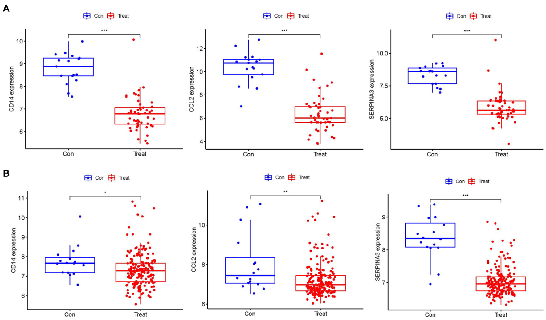 Identification of the expression level of the Hub gene. (A) The expression levels of hub genes, CD14, CCL2 and SERPINA3 in the training datasets were significantly lower in the cardiomyopathy group than in the control group. (B) The hub gene expression was verified in the large sample validation dataset (GSE5406), and the expressions of CD14, CCL2 and SERPINA3 in the cardiomyopathy group were significantly lower than those in the control group, of which SERPINA3 had the most significant difference. “***”, “**”, “*” represent P < (0.001, 0.01, 0.05).