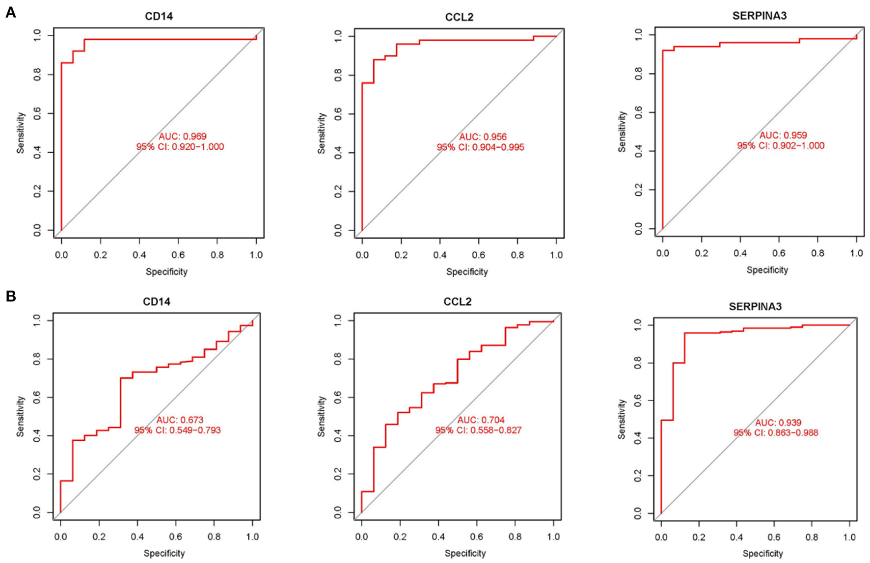 Using boxplots, the expression levels of the three hub genes were determined. In the training dataset, the cardiomyopathy group's expression levels of CD14, CCL2, and SERPINA3 were significantly lower than the ones in the control group. P values were all <0.001 (P < 0.001) (Figure 4A). Then, in a separate large-sample validation dataset, we further validated the expression levels of these three hub genes (GSE5406), and the results were like those of the training group, CD14 (P < 0.05), CCL2 (P < 0.01), and SERPINA3 (P < 0.001). The expression difference of SERPINA was most significant in the validation group (Figure 4B). Our next step was to assess the precision of the three hub genes as markers for discriminating between cardiomyopathy and control groups using ROC curves. In the training datasets, the area under the ROC curve (AUC) values of CD14, CCL2, and SERPINA3 genes were all > 0.95, indicating that these genes have high diagnostic values as marker genes (Figure 5A). In the validation dataset, the AUC values of the three genes CD14, CCL2, and SERPINA3 were 0.673, 0.704, and 0.939, respectively. Data from the large sample validation dataset indicated that all three genes could be used as marker genes, with SERPINA3 having the highest diagnostic sensitivity (Figure 5B).