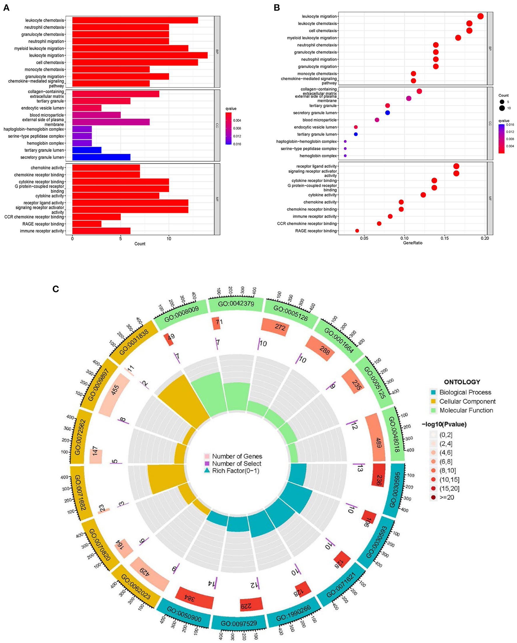 GO enrichment analysis of DEGs. (A) The histogram of GO enrichment analysis; the redder the color, the more significant the enrichment. (B) Bubble diagram representing GO enrichment analysis; the size of bubbles represents the number of enriched genes, and the redder the color of the bubbles, the more significant the enrichment is. (C) The first circle indicates that BP, CC, MF are represented by different colors and the top six enriched GO:ID are taken. The second circle represents the number of genes in different GO:ID genome backgrounds, where different colors represent the significant degree of DEGs enrichment. The third circle represents the number of genes enriched by DEGs. The fourth circle represents the proportion of genes.
