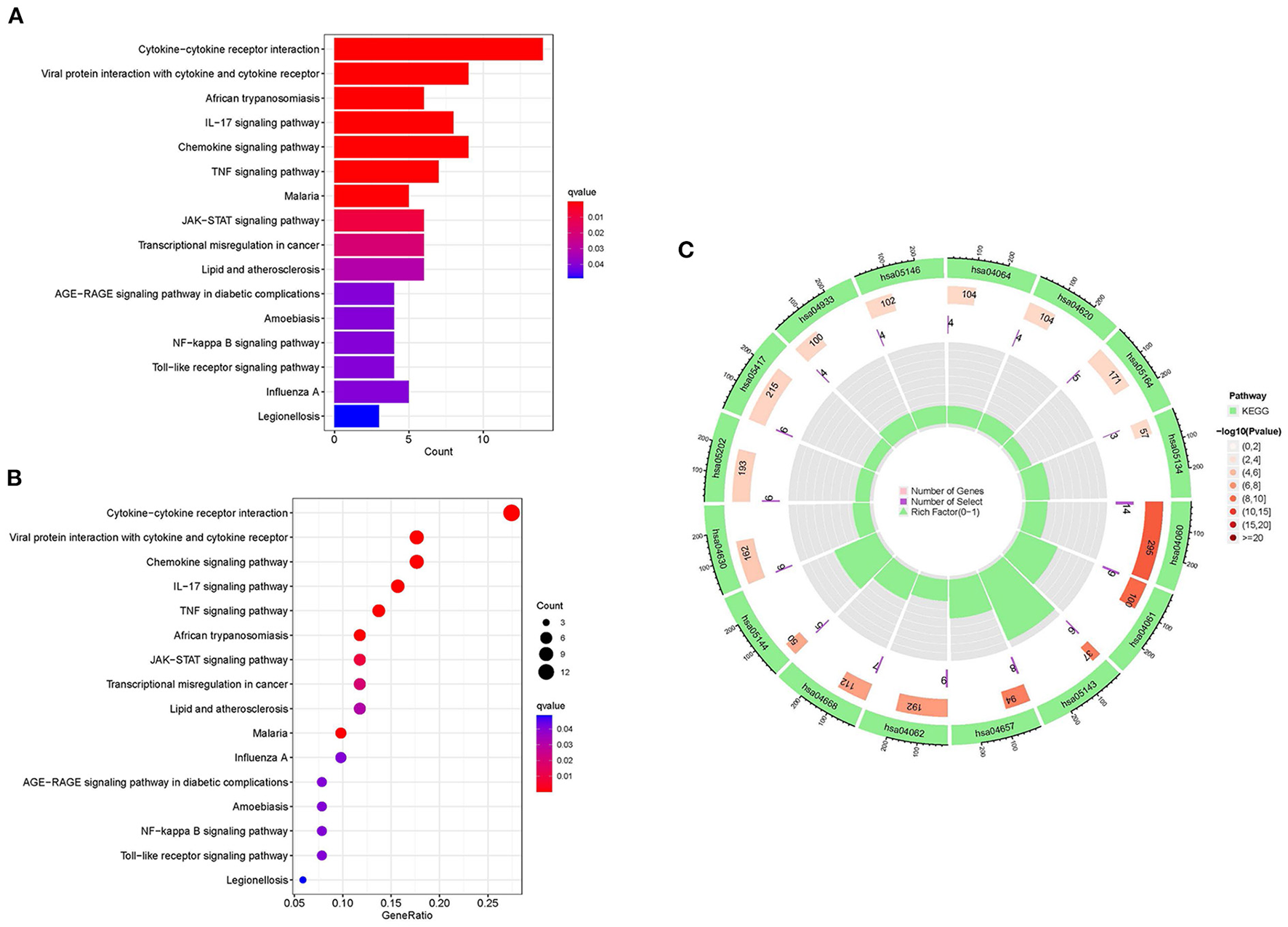 KEGG enrichment analysis of DEGs. (A) The histogram of KEGG enrichment analysis; the redder the color, the more significant the enrichment. (B) Bubble diagram representing KEGG enrichment analysis; the size of bubbles indicates the number of enriched genes, and the redder the color of bubbles, the more significant the enrichment is. (C) The first circle represents the enriched KEGG:ID. The second circle represents the number of genes in different KEGG:ID pathway backgrounds, where different colors represent the significant degree of DEGs enrichment. The third circle represents the number of genes for which DEGs are enriched in the pathway. The fourth circle represents the proportion of genes.