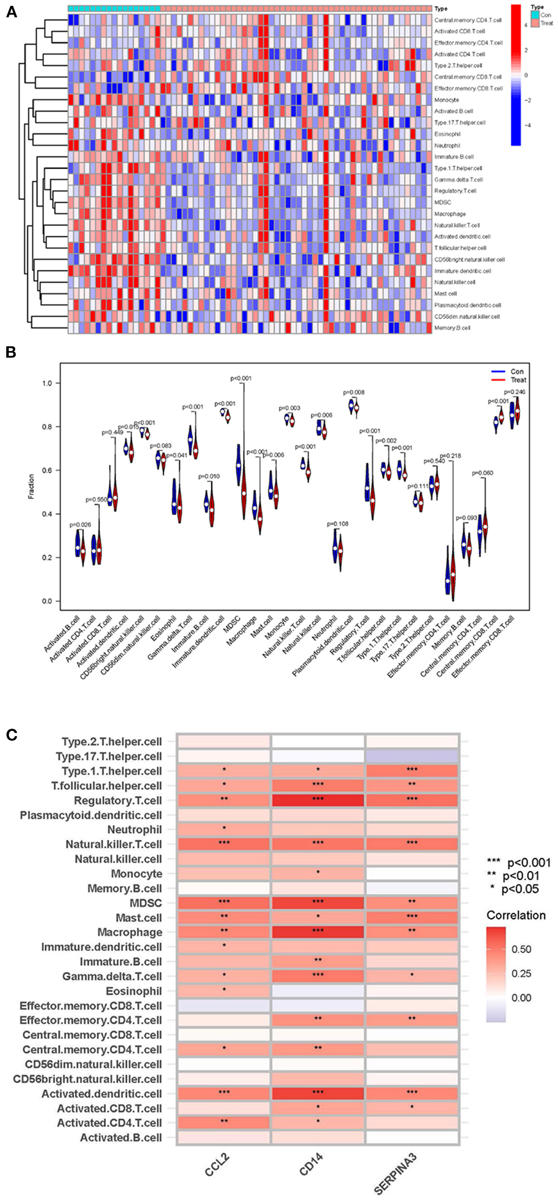 ssGSEA analysis of immune cell infiltration and its correlation with hub genes. (A,B) Heatmaps and violin plots showing the differences and distribution of 28 immune cells in cardiomyopathy and control groups. (C) The relation between immune cell infiltration and three hub genes; the redder the color, the more significant the difference. “***”, “**”, “*” represent P < (0.001, 0.01, 0.05).
