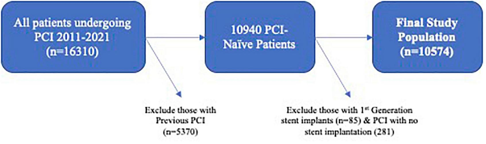 This was an observational study to determine associations between patient and operator characteristics and IVUS use, in addition to associations between IVUS use and favorable clinical outcomes. The study population was 10,574 consecutive patients undergoing their first PCI with second-generation stent implantation at Harefield Hospital between January 1st 2011 and January 1st 2021. The study flow-chart is shown in Figure 1. Patients who underwent optical coherence tomography (OCT) were excluded.