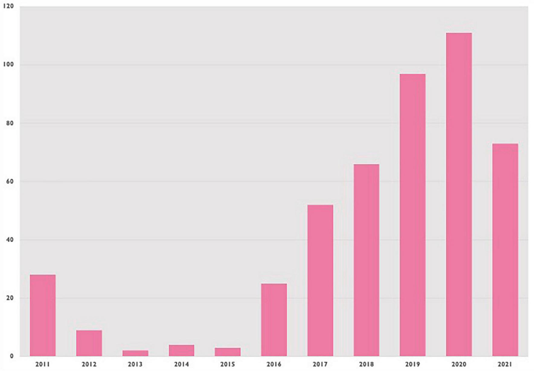 IVUS was used in 455 patients, or 4.3% of cases. Figure 2 shows IVUS procedures (for all patients) over time, showing a general trend upwards since 2011. Median follow-up for all included patients was 1,691 days (IQR 753–2796).