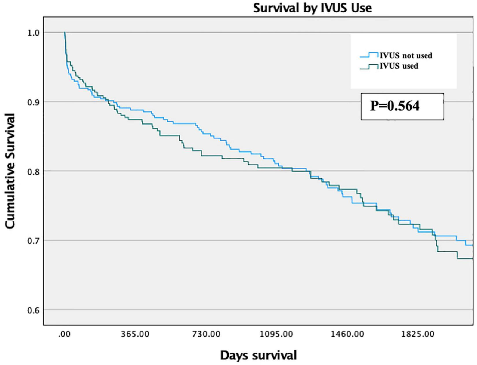 Adjusting for significant comorbidities, there was no significant difference in MACE at 1 year using IVUS [OR 1.04 (0.73—1.5), p = 0.81], 1-year mortality [OR 1.055 (0.65–1.71) p = 0.828] nor mortality throughout the study period [HR 0.93 (0.69—1.26), p = 0.638]. Furthermore, there was no difference in the device endpoint of MI/Death/TLR at 1 year [OR 1.15 (0.85–1.56) p = 0.361].