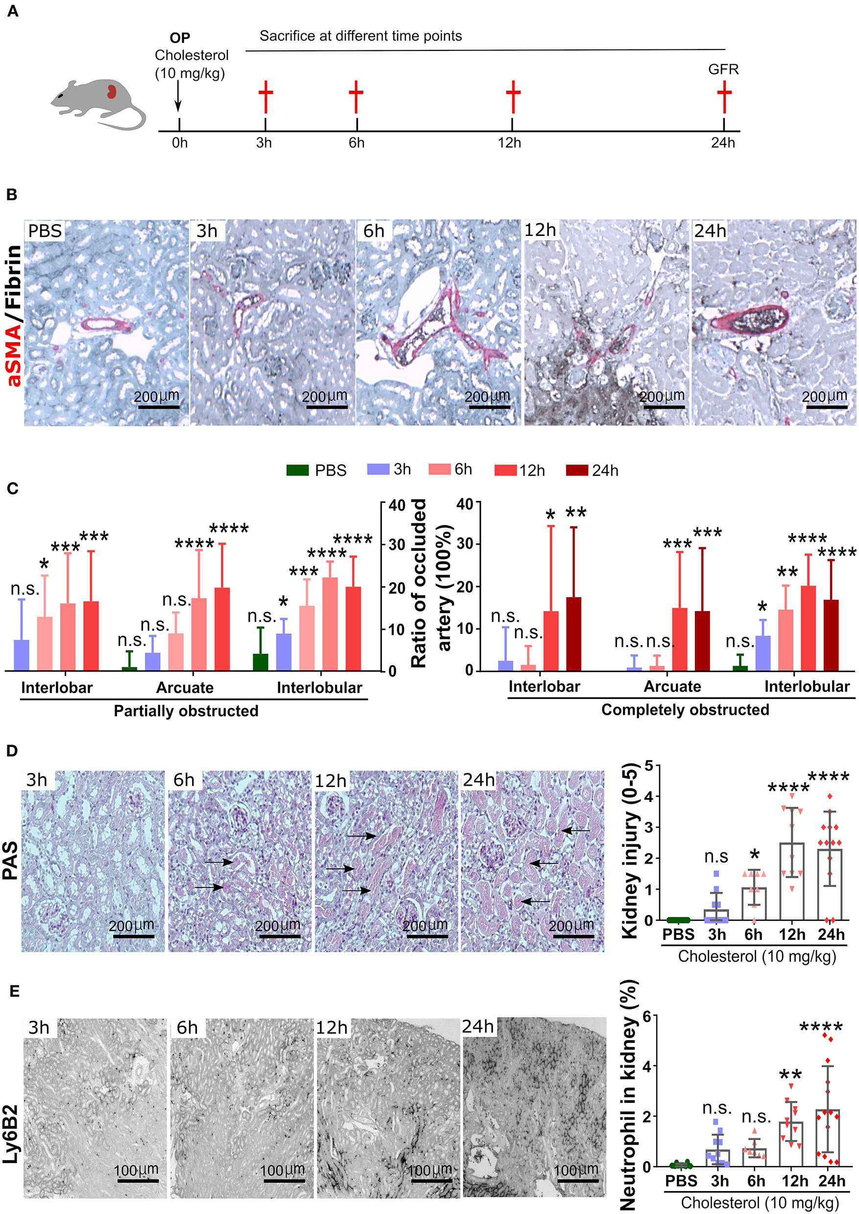 Time kinetics of crystal clots formation and growth. (A) Schematic of experiment. (B) Representative images of aSMA/Fibrin staining at 3, 6, 12, and 24 h post CC injection and PBS control. (C) Partially and completely obstructed arteries in the kidney 24 h post-CC injection (n = 8–12 mice/group). (D) Representative images of PAS staining at 3, 6, 12, and 24 h post-CC injection, and kidney injury score (n = 8–12 mice/group). (E) Representative images of Ly6B2+ staining at 3, 6, 12, and 24 h post-CC injection, and neutrophils percentage in the kidney (n = 8–14 mice/group). Data are means ± SD. One-way ANOVA. *P < 0.05; **P < 0.01; ***P < 0.001. ****P < 0.001.