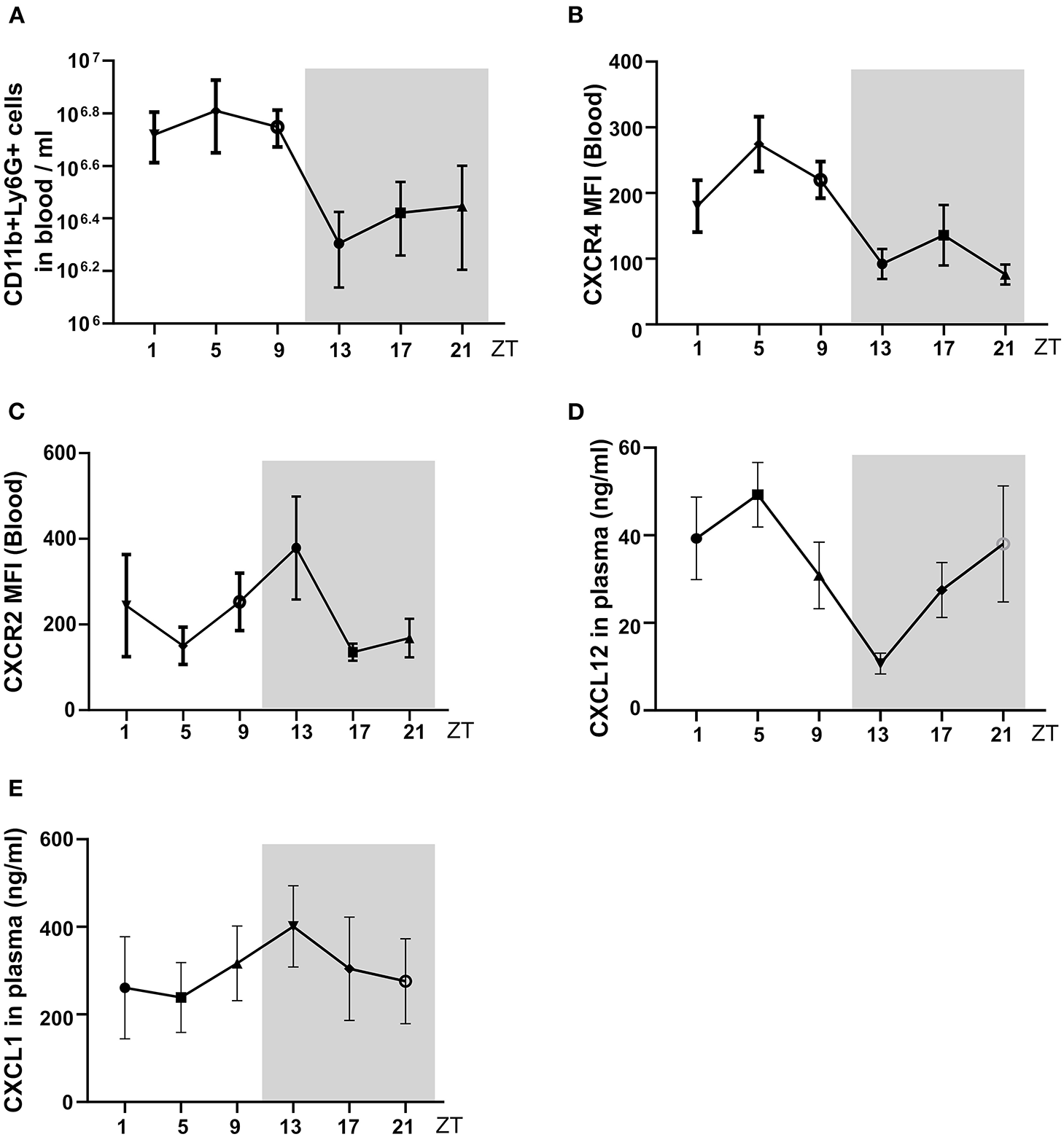 The circadian oscillations of neutrophils, and chemokine in mouse blood in a healthy state. (A) Flow cytometric quantification of neutrophils baseline in the blood. (B,C) MFI of surface CXCR4 (B, n = 5 mice/group) and CXCR2 (C, n = 5 mice/group) expression by neutrophils in the blood as determined by flow cytometry. (D,E) Plasma levels of CXCL12 (D, n = 5 mice/group) and CXCL1 (E, n = 5 mice/group) in healthy mice as determined by ELISA. Data are means ± SD. MFI: mean fluorescence intensity; CXCR2, CXC chemokine receptor 2; CXCR4, CXC chemokine receptor 4; CXCL12, CXC motif chemokine ligand 12.