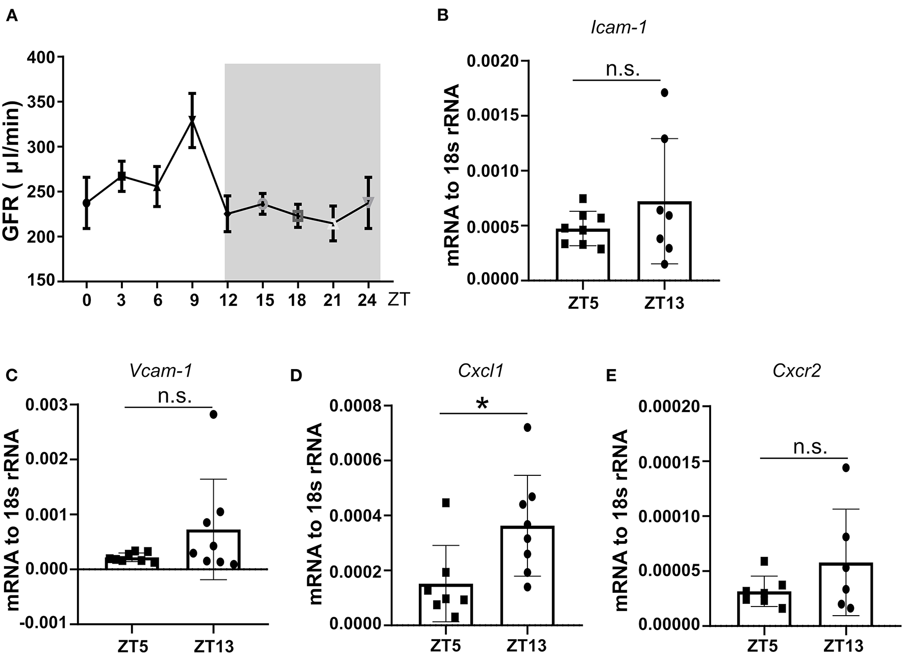 The circadian oscillation of mouse GFR, kidney mRNA expression levels of adhesion molecules, and chemokines at ZT5 and ZT13 in a healthy state. (A) Circadian oscillations of mouse GFR in the healthy state (n = 8–10 mice/group). (B,C) mRNA expression of adhesion molecule Icam-1 (B, n = 7–8 mice/group) and Vcam-1 (C, n = 7–8 mice/group) in mice kidney at ZT5 and ZT13. (D) mRNA expression of neutrophil mediating chemotaxis Cxcl1 (D, n = 7–8 mice/group) and its receptor Cxcr2 (E, n = 6–7 mice/group) at ZT5 and ZT13. Icam-1, intercellular adhesion molecule 1; Vcam-1, vascular cell adhesion molecule 1; Cxcr2, CXC chemokine receptor 2; Cxcl1, CXC motif chemokine ligand 1. While background: daytime, gray background: nighttime. Data are means ± SD, unpaired Student's t-test, *P < 0.05.