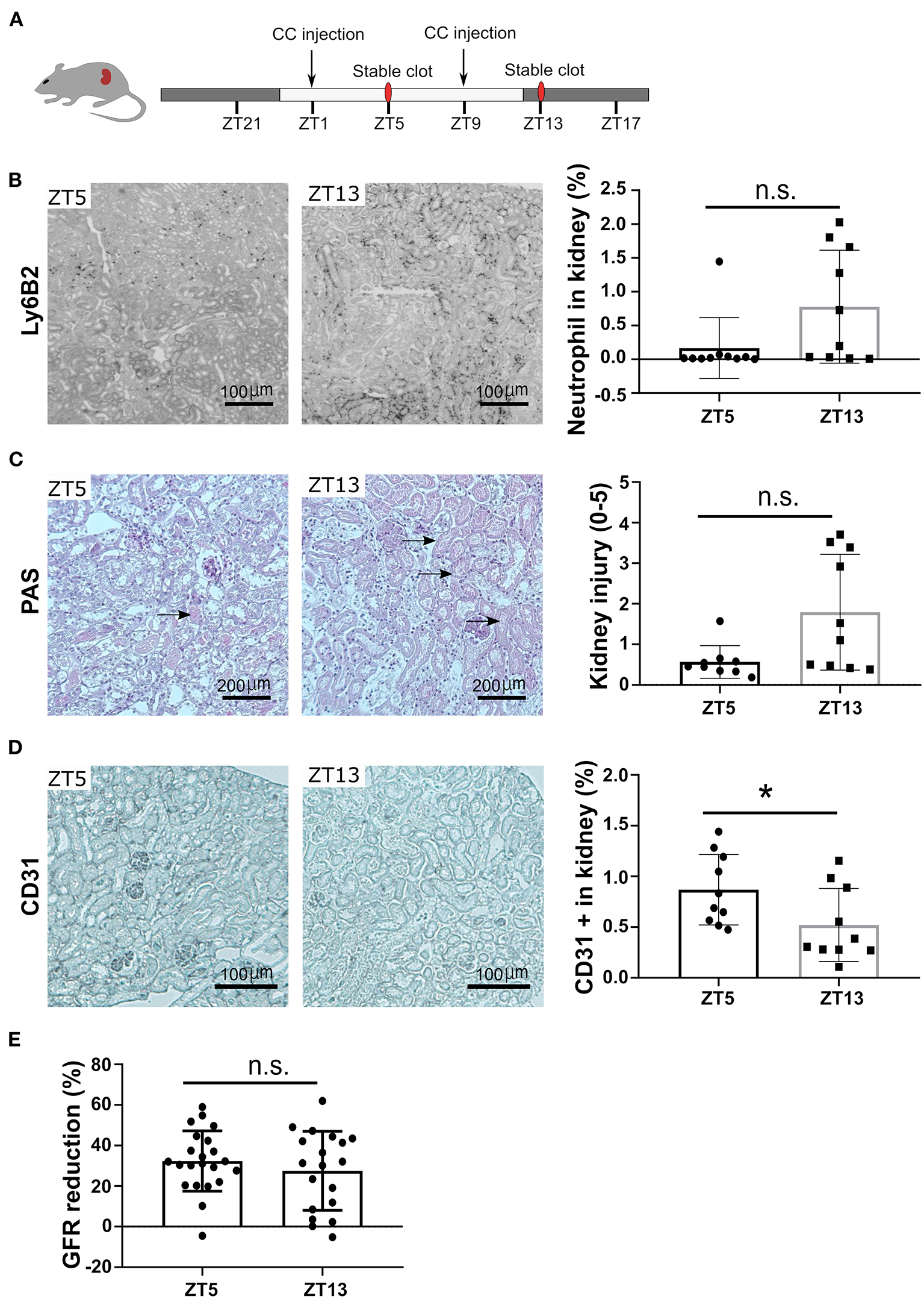 To follow the pathophysiological function of the circadian rhythm-induced CXCR2+ neutrophil recruitment in the kidney, we performed CC embolism at different time points. According to the above-indicated results from time kinetics of crystal clot formation, we injected CC at ZT1 and ZT9 to study the pathological impact of different neutrophil numbers on CC-induced ischemic kidney necrosis at ZT5 and ZT13, respectively (Figure 4A). Interestingly, mice subjected to CC embolism at ZT13 had higher neutrophil counts in the ischemic area 24 h post-CC embolism compared to ZT5 (Figure 4B). In line with the enhanced neutrophil infiltration after ZT13 CC embolism, kidney tubular injury tended to be higher in mice with ZT13 compared to ZT5 (24 h post-CCE), albeit the differences were not significant (Figure 4C). Consistent with the increased levels of neutrophils, the CC-injected kidney showed significantly increased endothelial injury at ZT13 (Figure 4D). Of note, the GFR reduction 24 h post-CC injection did not differ between ZT5 and ZT13 (Figure 4E). These results suggest that time of day had an effect on CC embolism-induced ischemic kidney necrosis, endothelial injury, and neutrophil infiltration but not in GFR loss.