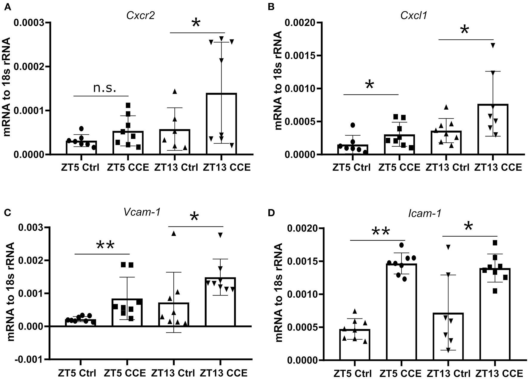 Enhanced kidney neutrophil recruitment is CXCR2 dependent. The intrarenal mRNA expression level of Cxcr2 (A, n = 6–8 mice/group), Cxcl1 (B, n = 7–8 mice/group), Vcam-1 (C, n = 7–8 mice/group), and Icam-1 (D, n = 7–8 mice/group) at ZT5 and ZT13 before and post-CC injection. Data are means ± SD. Icam-1, intercellular adhesion molecule 1; Vcam-1, vascular cell adhesion molecule 1; Cxcr2, CXC chemokine receptor 2; Cxcl1, CXC motif chemokine ligand 1. Unpaired Student's t-test, *P < 0.05, **P < 0.01.