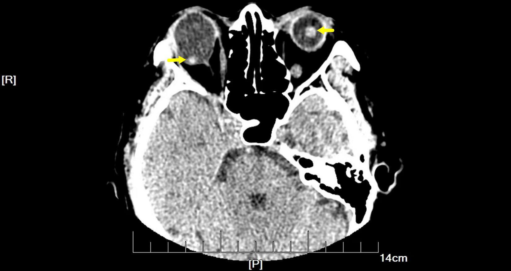 Orbital computed tomography (CT) demonstrated free-floating lenses in the posterior poles (yellow arrows).