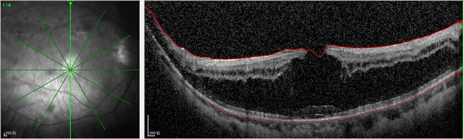 The patient was diagnosed with homocystinuria, osteoporosis, ectopia lentis, lamellar macular hole, and retinoschisis. The patient was treated with vitamin B6 and folic acid. She chose to defer surgery and was advised to undergo physical and ophthalmic examinations every 6 months. During the 3-year follow period, her condition remained stable. The patient did not provide any other chief complaints. Her intraocular pressure was normal, and SD-OCT images remained unchanged.