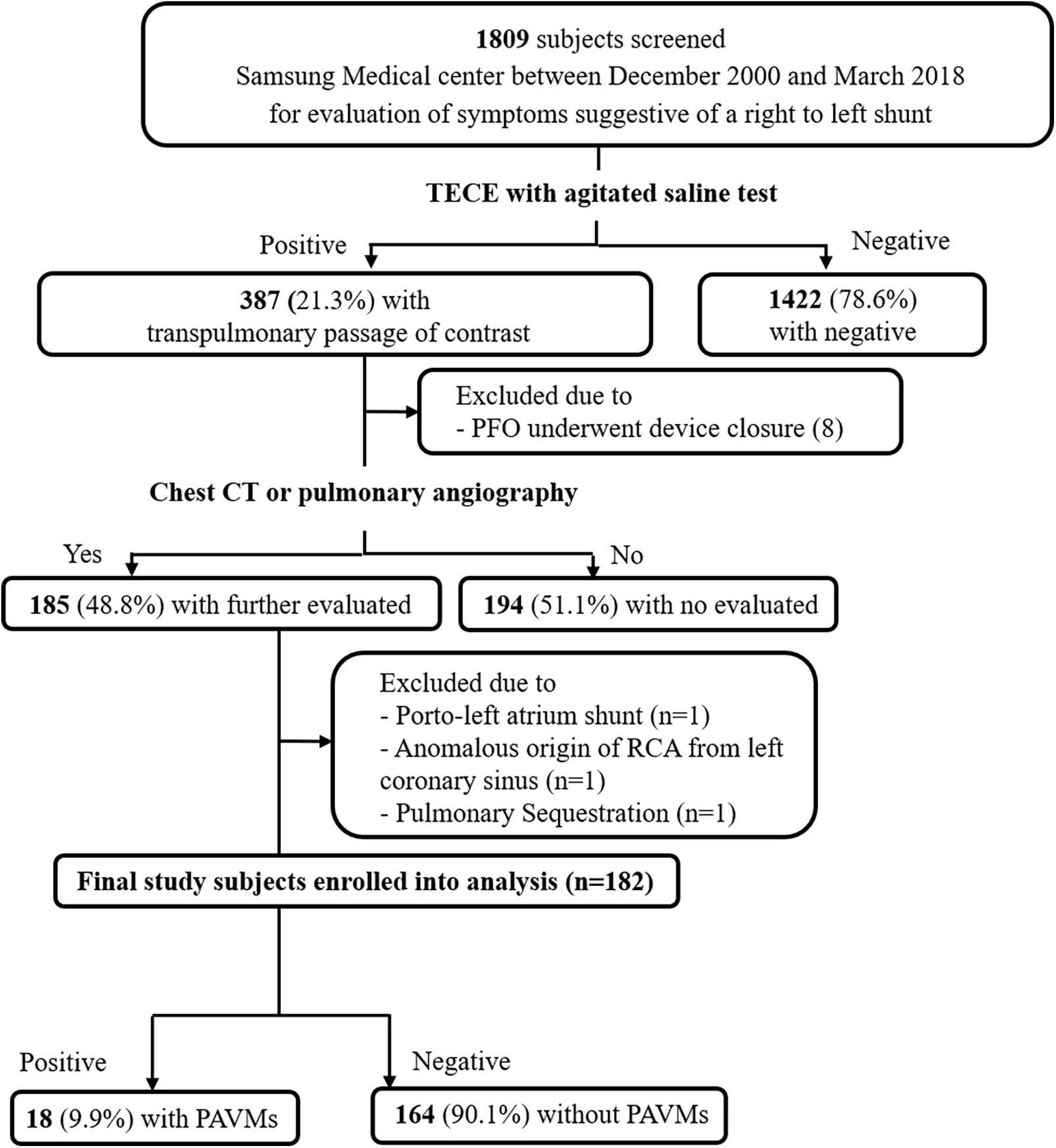 Figure 1. A schematic diagram of study patient selection. TECE, transesophageal contrast echocardiography; PFO, patent foramen ovale; CT, computed tomography; RCA, right coronary artery; PAVM, pulmonary arteriovenous malformation.