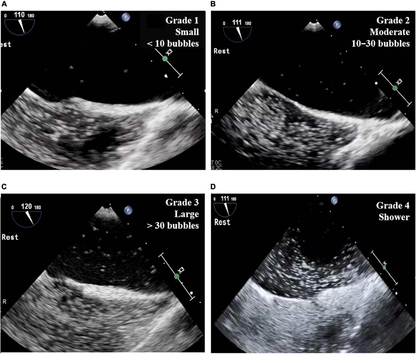 Figure 2. Grade of TECE with agitated saline test. (A) Grade 1 (small): fewer than 10 bubbles in LA; (B) grade 2 (moderate): 10–30 bubbles in LA; (C) grade 3 (large): more than 30 bubbles in LA; (D) grade 4 (shower): extensive contrast in LA. TECE, transesophageal contrast echocardiography; LA, left atrium.