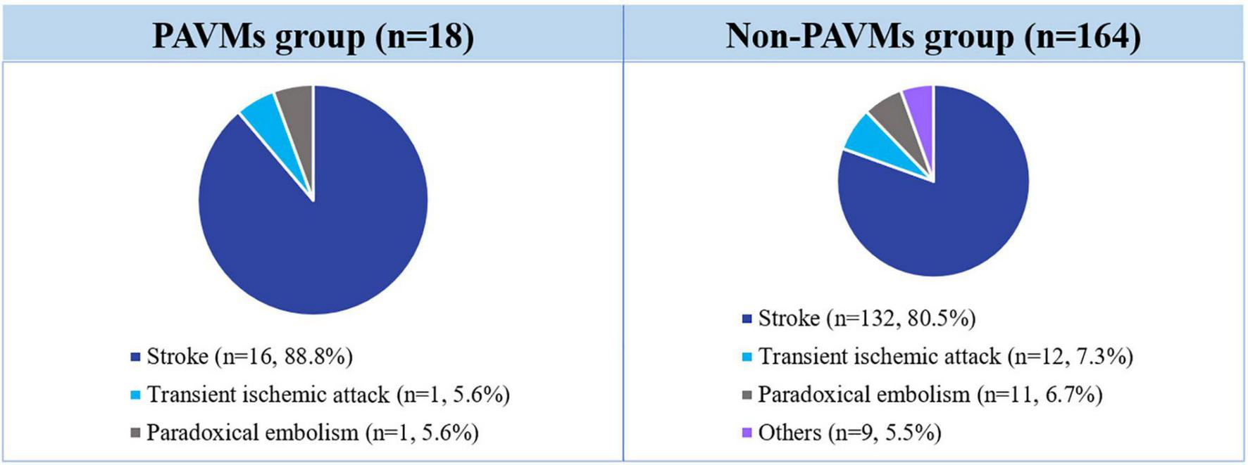 Of the 1,809 subjects who underwent TECE with the agitated saline test who were reviewed in this study, 387 (21.3%) patients had confirmed the presence of transpulmonary bubble passage in their TECE findings, which was considered to indicate the presence of a PAVM. Only the 182 patients who underwent a further image study (chest CT or pulmonary angiography) were finally included in this study and divided into the PAVM group (n = 18) and the non-PAVM group (n = 164). All patients had symptoms suggestive of right to left shunts, such as a PAVM. The main symptomatic reasons for performing TECE with the agitated saline test were stroke (n = 148, 81.3%), transient ischemic attack (n = 13, 7.1%), paradoxical arterial embolism (n = 12, 6.6%), and other, including migraine and hypoxia (n = 9, 4.9%). Further information is provided in Figure 3.