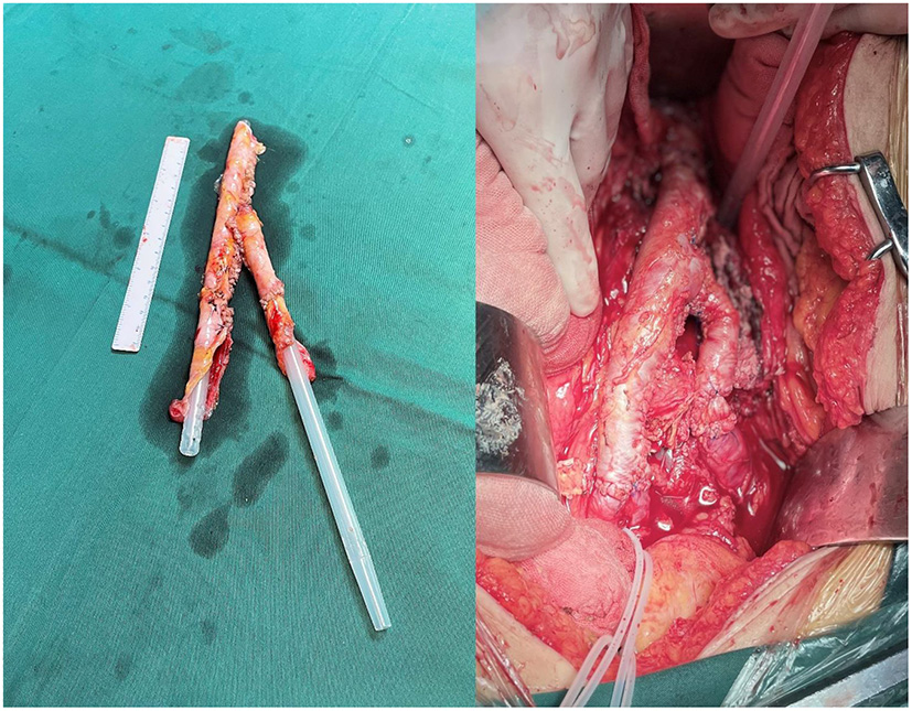 Elective surgery was performed in 4 cases. In two cases (Cases 1 and 2), the site of the disease was the lower abdominal aorta. Among them, in case 1, a localized protrusion about 2 cm above the level of the rectus abdominis bifurcation was observed during surgery, severe adhesion between the duodenum and the inferior vena cava, necrotic infected tissue around the abdominal aorta was removed, a break was found after trimming the abdominal aortic wall, and the anterior wall of the abdominal aorta was repaired in situ using autologous peritoneal-fascial tissue with the posterior rectus sheath as a patch; in case 2, due to the wide range of abdominal aortic infection and severe adhesion of the surrounding tissue, infectious abdominal aortic aneurysm resection was decided during surgery. A bifurcated tubular in situ reconstruction of the abdominal aorta-bilateral iliac arteries were made using autologous peritoneal-fascial tissue suture with the posterior rectus sheath (Figure 1). The other 2 cases (Cases 3 and 4) were found to have abdominal aorta-duodenal fistulas, one of which (Case 3) had previously undergone EVAR at another hospital, during which significant stent exposure was observed after removing the necrotic tissue around the abdominal aorta. In contrast, a fistula was observed at the horizontal duodenum; after freeing the abdominal aortic fistula, the abdominal aortic stent graft was removed to remove the local arterial wall adhered to the abscess and edematous and to avoid stenosis and tear after the abdominal aortic suture, the infected abdominal aorta was reconstructed in situ using autologous peritoneal-fascial tissue with the posterior rectus sheath of the rectus abdominis muscle, duodenal fistula repair, gastrojejunostomy, and cholecystostomy. In the other case (Case 4), after local debridement of the abdominal aorta at the site of infection, the horizontal part of the duodenum was invaded and ulcerated by the aneurysm. The pseudoaneurysm tumor was filled with a large amount of thrombus, necrotic material, and pus, which was completely removed and sent for bacterial culture. Exploration showed large damage of about 2 × 4 cm in the left wall of the middle abdominal aorta, and an autologous peritoneal-fascial tissue patch with a posterior rectus sheath was used to repair the defective abdominal aorta, followed by duodenal fistula repair and enterostomy.